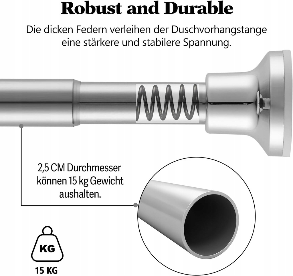 Dzięki antypoślizgowym gumowym końcówkom drążek teleskopowy zapewnia bardzo mocne i bezpieczne trzymanie, a tym samym maksymalną ładowność, wytrzymałość obciążenia 15 kg.