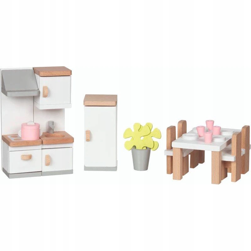 Komplet stylowych mebelków umożliwiający aranżację kuchni i jadalni w domku dla lalek Wszystkie elementy wyglądają bardzo realistycznie. Odgrywanie scenek z udziałem laleczek wpływa na rozwój wyobraźni i kreatywności dziecka. Niewielkie kubeczki, garnek czy roślinka doniczkowa nadają zestawowi wyjątkowego uroku.