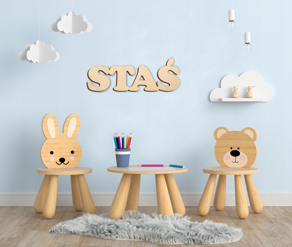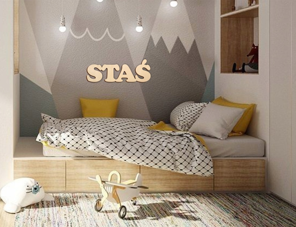 Imię można przykleić do ściany za pomocą taśmy montażowej, specjalnych "samoprzylepnych gwoździ"lub powiesić na gwoździach.