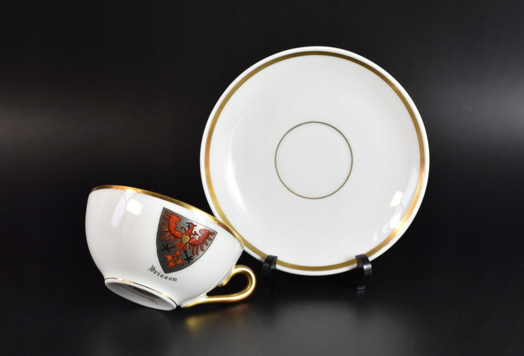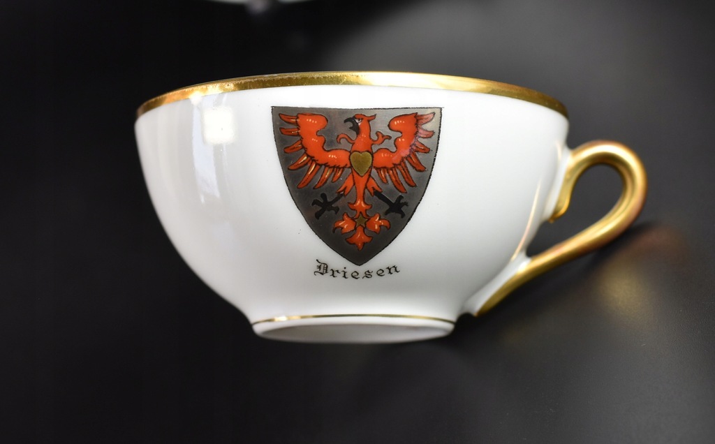 Stara, mała filiżanka pamiątkowa z herbem miejscowości Drezdenko (napis w języku niemieckim "Driesen").