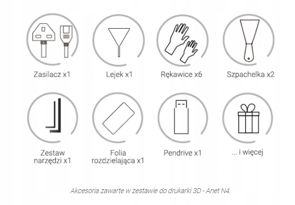 W zestawie oprócz drukarki znajdują się także akcesoria dodatkowe. Narzędzia pomagają w procesie druku modelu 3D.