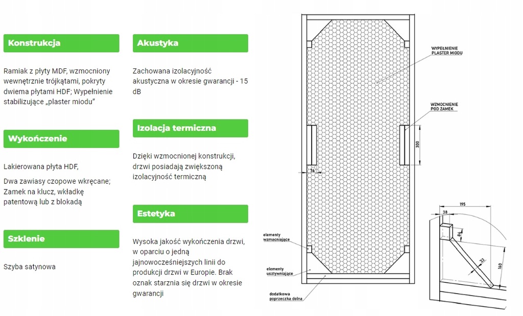 Ramiak z płyty MDF, wzmocniony wewnętrznie trójkątami, pokryty dwiema płytami HDF; Wypełnienie stabilizujące „plaster miodu”