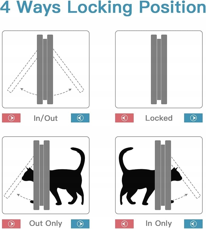 - Drzwiczki dla zwierząt można ustawić w 4 trybach za pomocą czerwonych i zielonych przełączników z zakładkami: tylko wyjście, tylko wejście i wyjście oraz całkowicie zamknięte, co ułatwia kontrolę wejścia i wyjścia zwierzęcia.