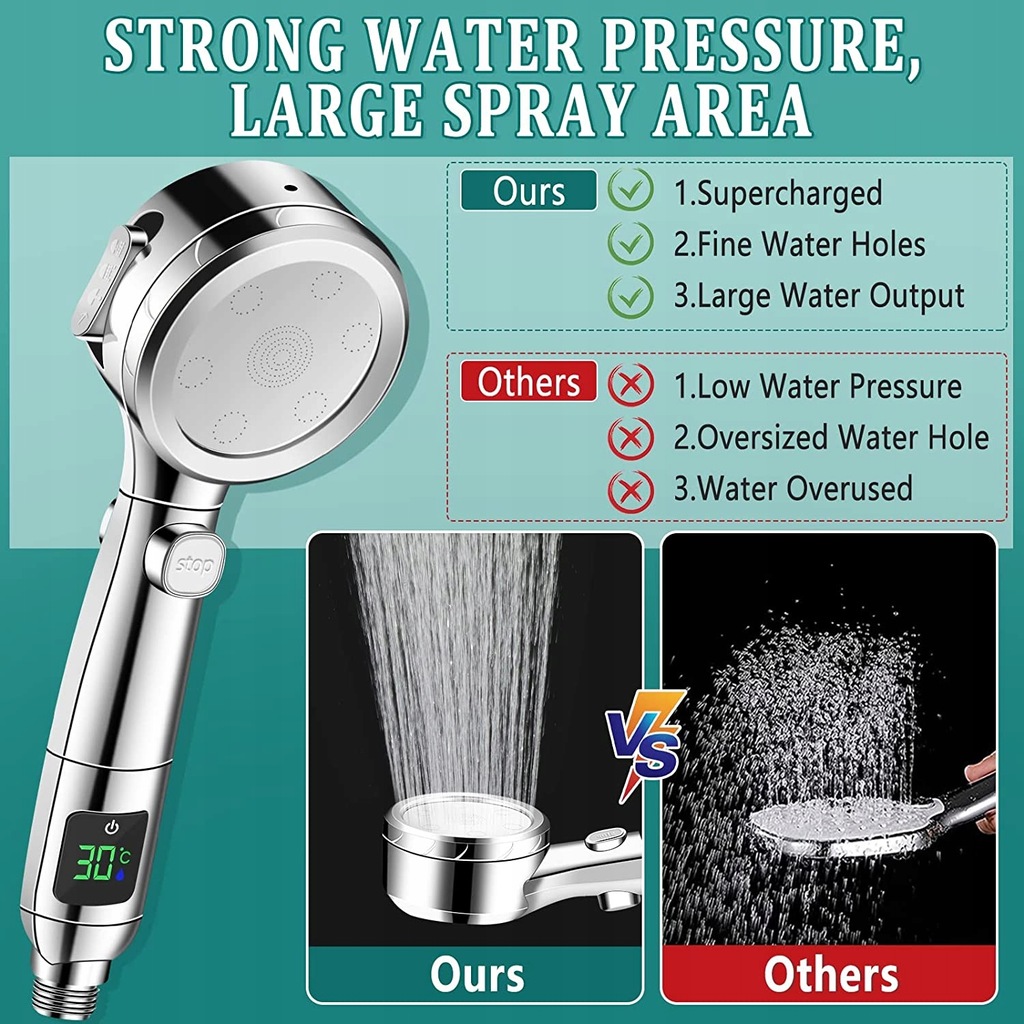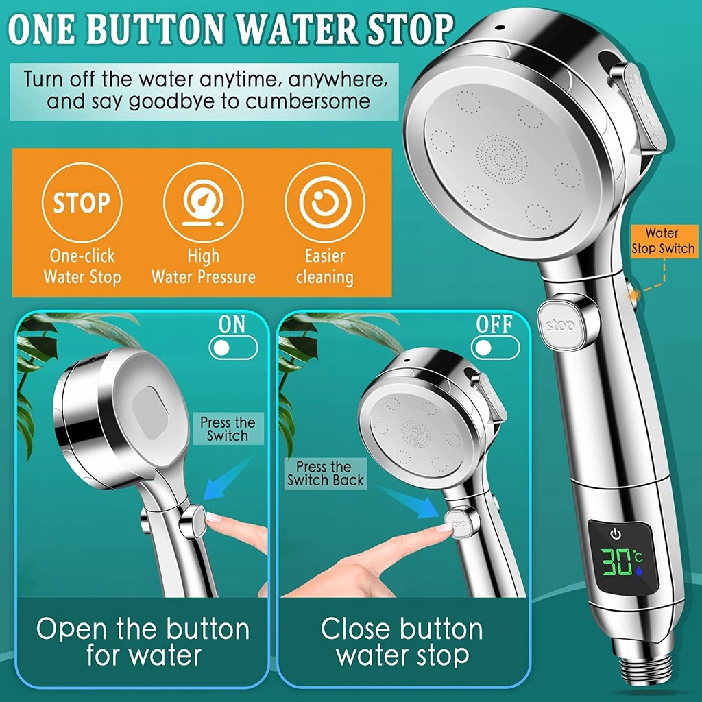 - Wyświetlacz temperatury głowicy prysznicowej - Dotknij przełącznika, nasza wysokociśnieniowa głowica prysznicowa może bezpośrednio odczytać temperaturę i pomóc wybrać najlepszą temperaturę wody, nie wymaga baterii, krople wody poniżej 38 stopni będą wyświetlane na niebiesko, a powyżej 38 stopni na czerwono. Nigdy więcej martwienia się, że woda dla twojej rodziny jest zbyt gorąca lub zbyt zimna, idealna do kąpieli dzieci, osób starszych i mycia zwierząt domowych