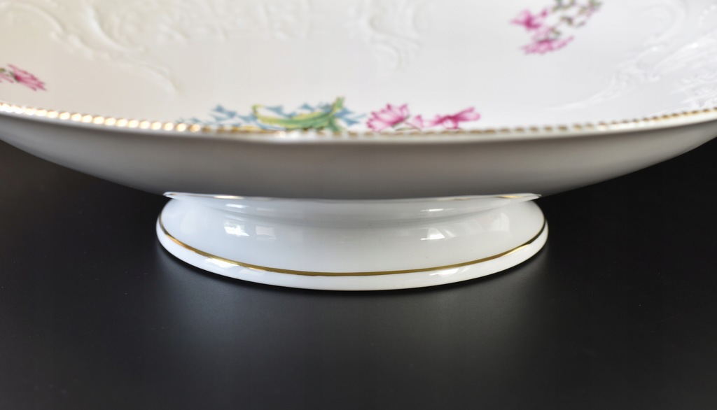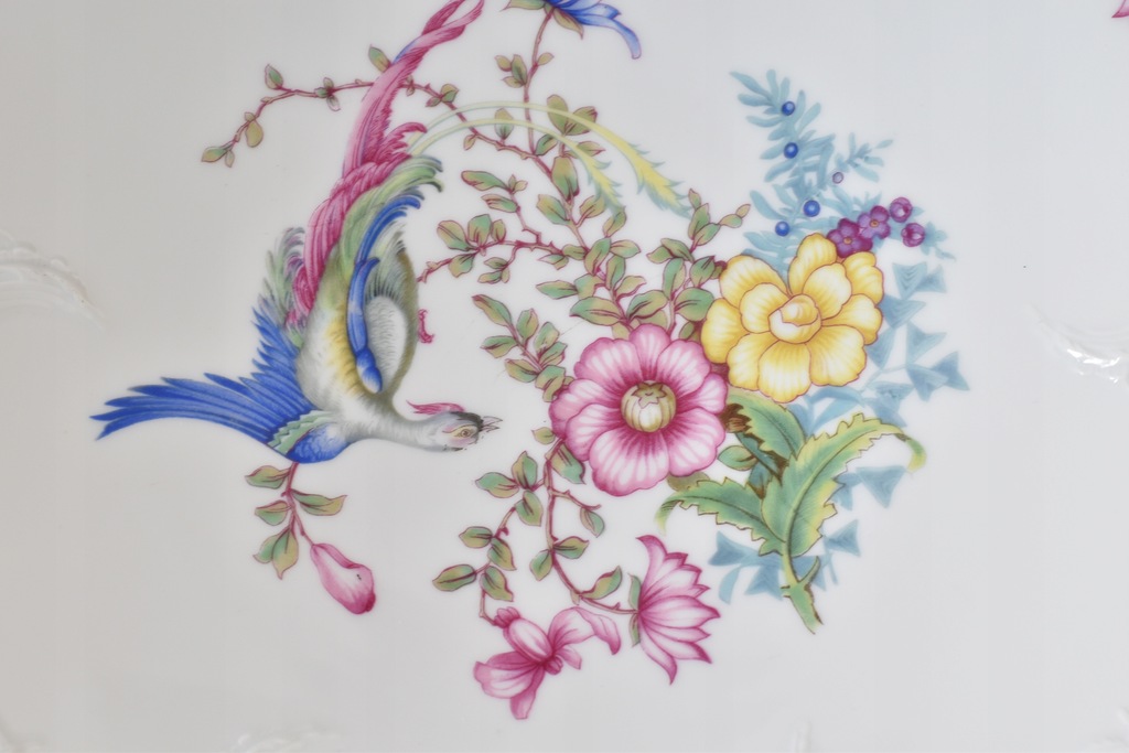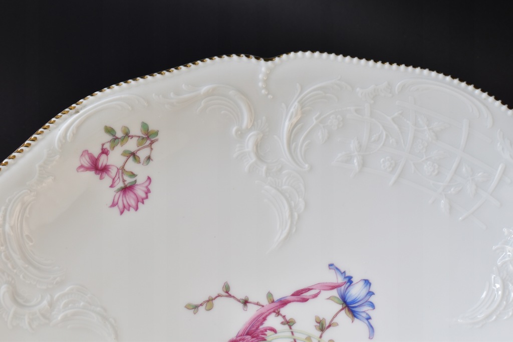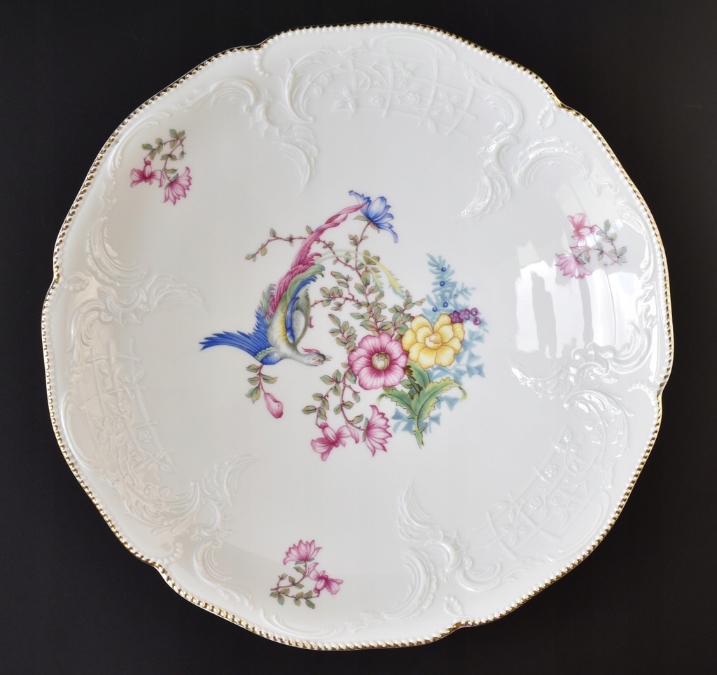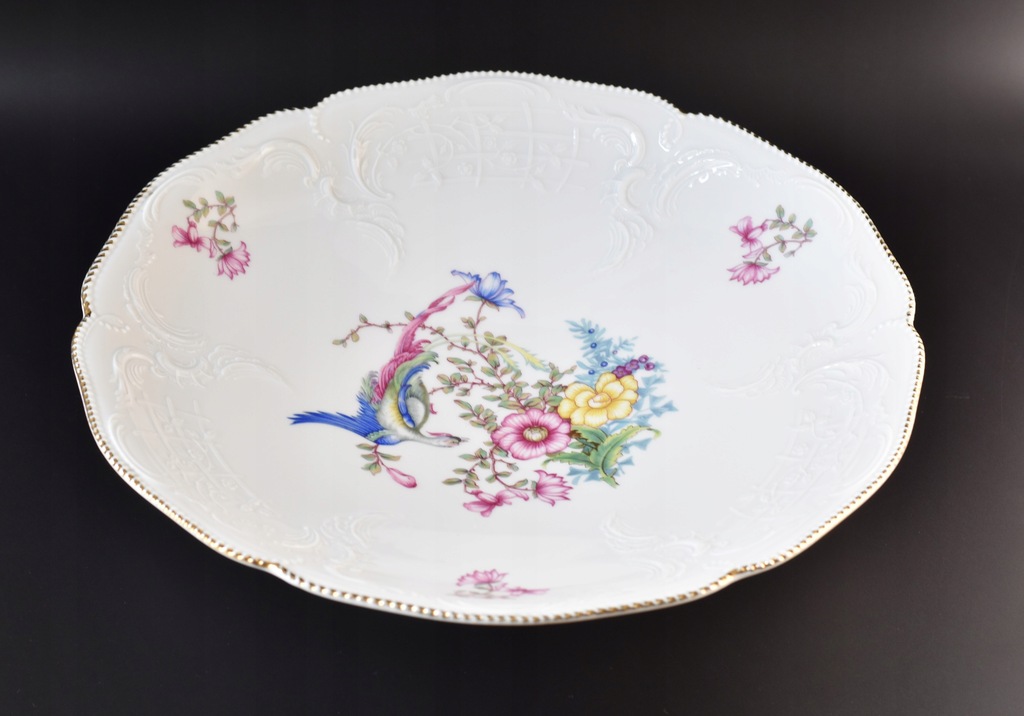 Bardzo duża, ozdobna patera na stopie ze znanej, niemieckiej manufaktury Rosenthal. Porcelana z serii Sanssouci zdobiona motywem rajskiego ptaka wśród kolorowych kwiatów. Całość zaakcentowana pięknymi, delikatne reliefami oraz złoconym rantem.