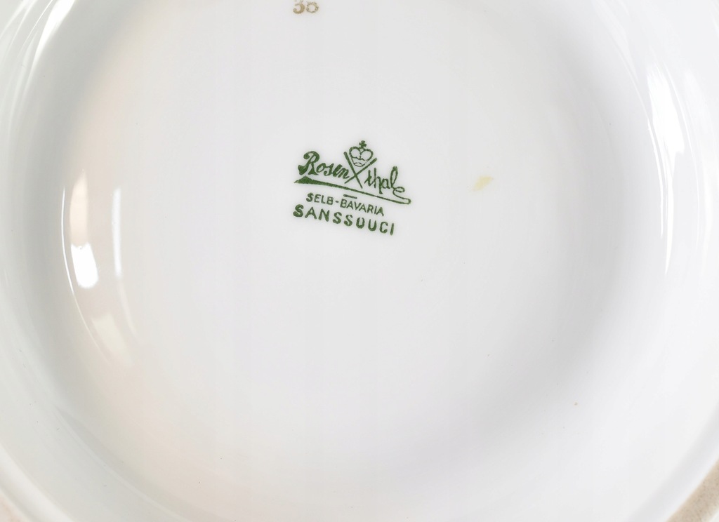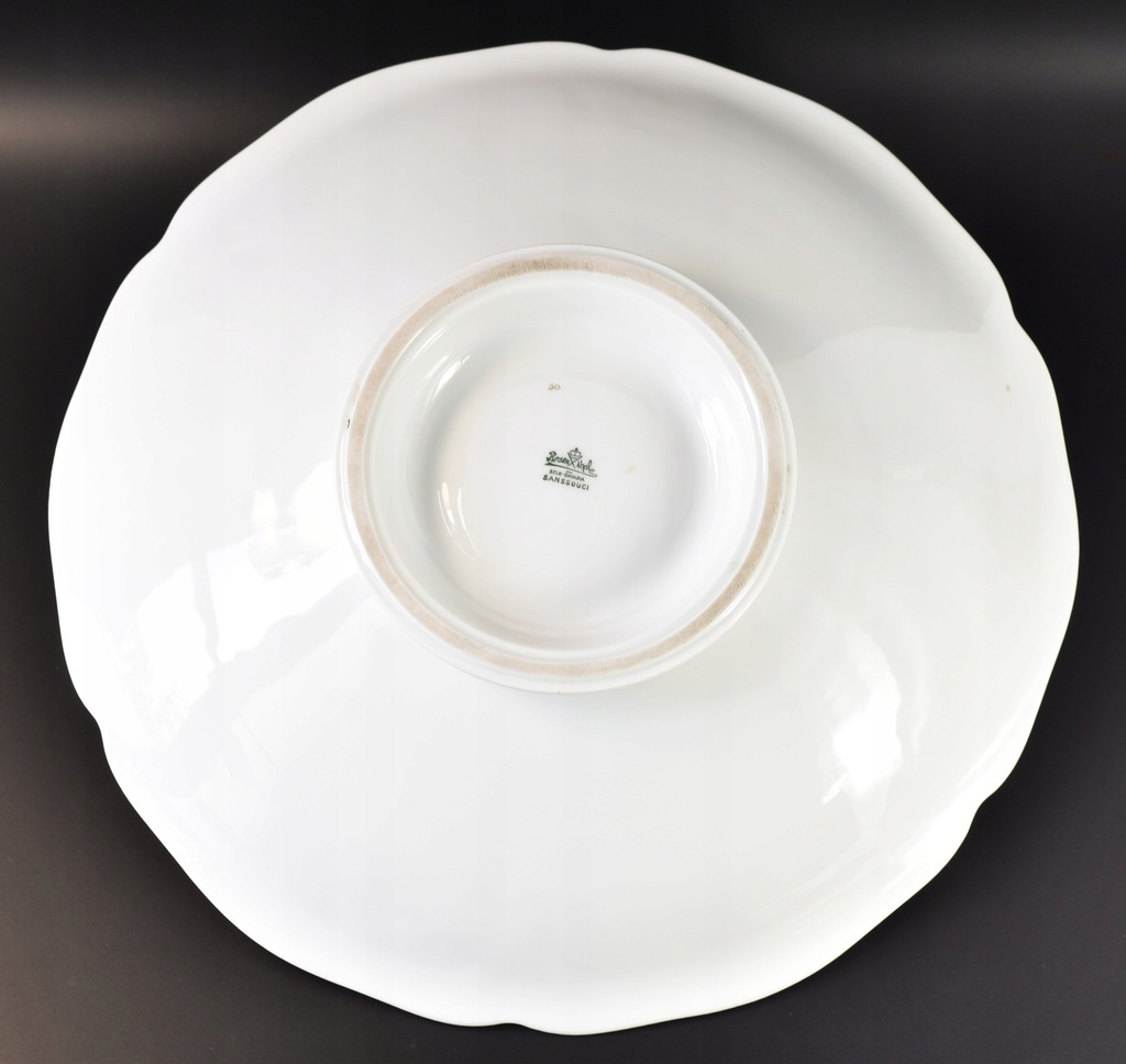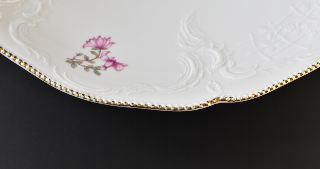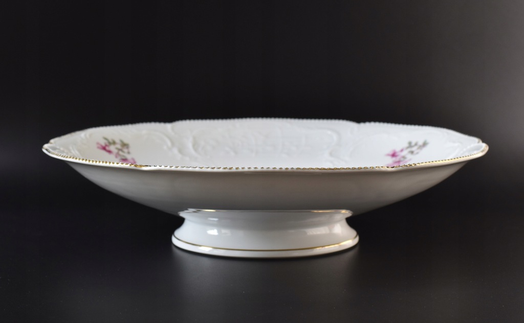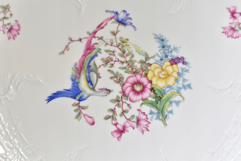 Bardzo duża, ozdobna patera na stopie ze znanej, niemieckiej manufaktury Rosenthal. Porcelana z serii Sanssouci zdobiona motywem rajskiego ptaka wśród kolorowych kwiatów. Całość zaakcentowana pięknymi, delikatne reliefami oraz złoconym rantem.