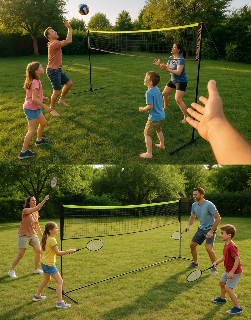 Szukasz wielofunkcyjnej siatki, która świetnie sprawdzi się podczas gry w siatkówkę, badmintona, siatkonogi lub tenisa? Nasza regulowana siatka 4w1 to doskonały wybór dla osób, które nie chcą ograniczać się do jednego sportu! Świetne rozwiązanie do zabawy dla całej rodziny na setki godzin w przydomowym ogrodzie czy na działce.