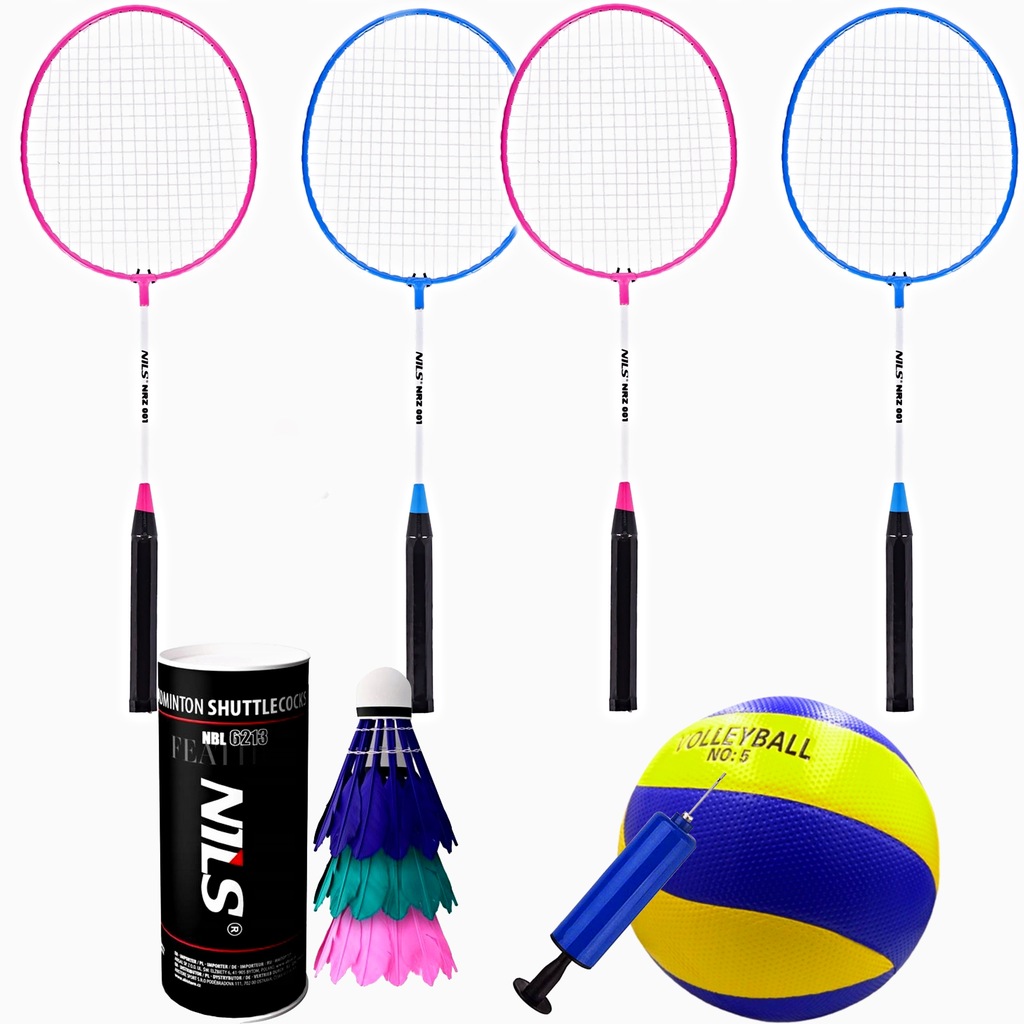 - kompletny zestaw gotowy do gry z 4 rakietkami, 3 lotkami, piłką do siatkówki i pompką