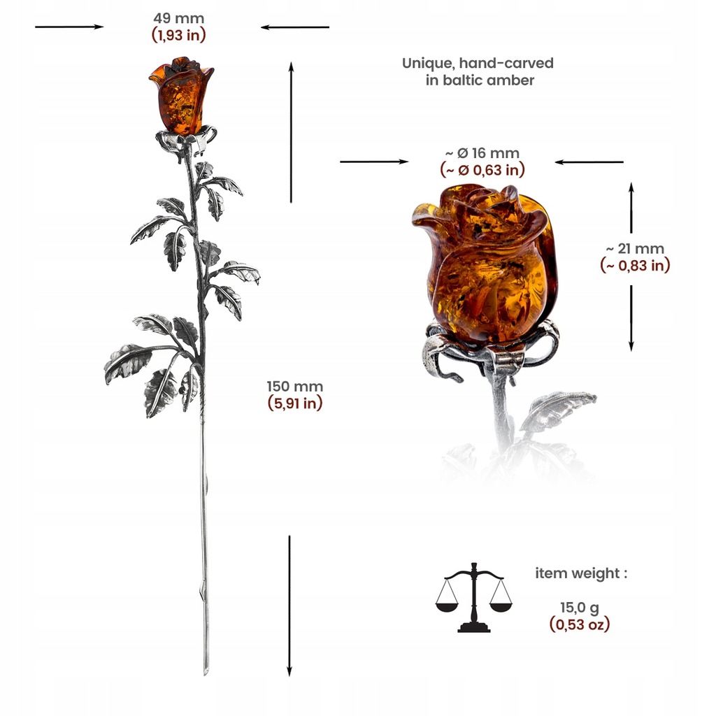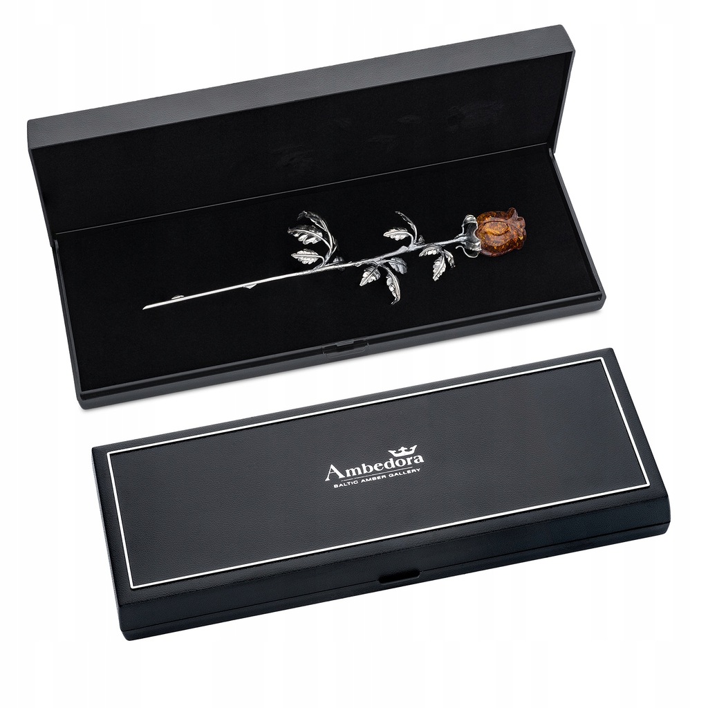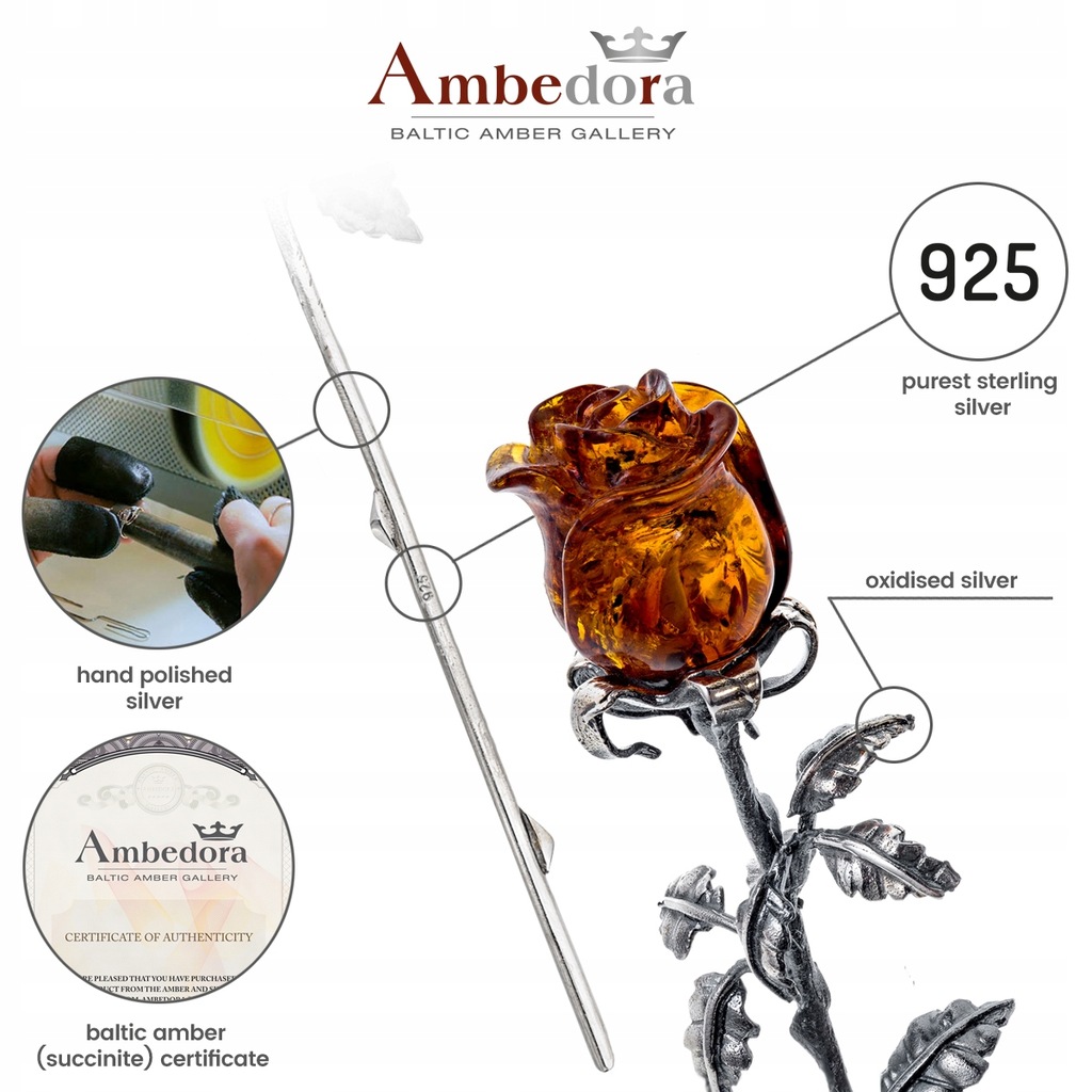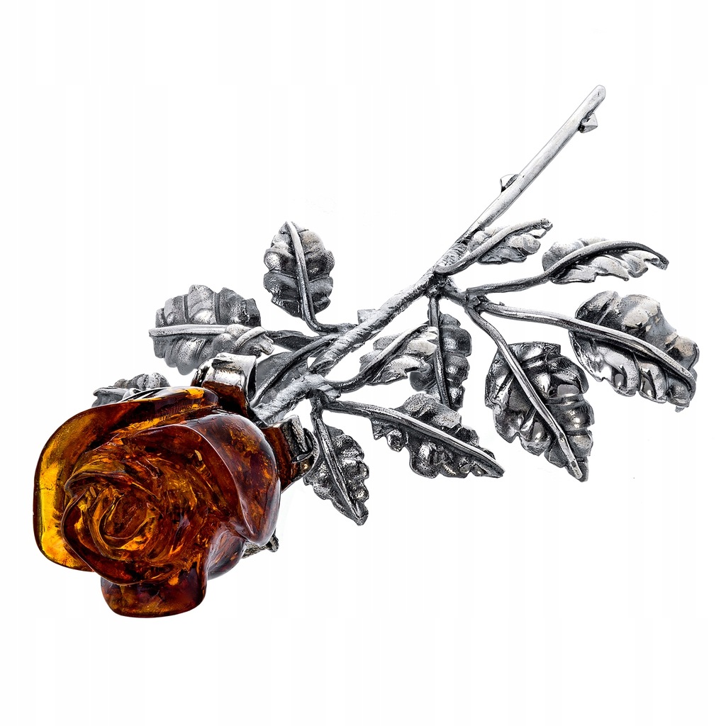 Srebrna wieczna róża z bursztynową główką w kolorze koniakowym. Róże są ręcznie rzeźbione w naturalnym bursztynie bałtyckim, dlatego każdy kwiat jest unikalny. Na wyrobie bita próba srebra 925. Do każdego wyrobu załączamy metkę jubilerską z podaniem producenta, próby i wagi srebra oraz certyfikat autentyczności bursztynu.