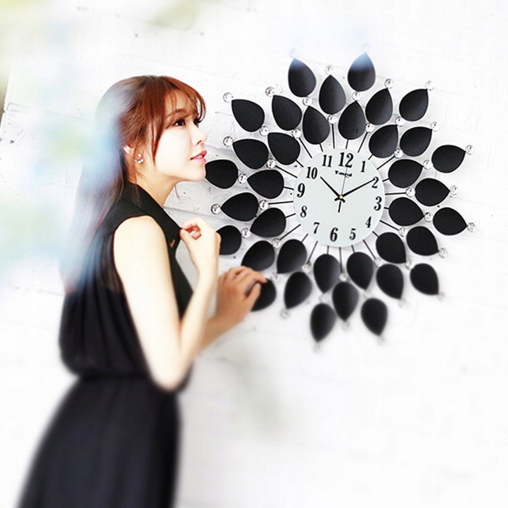 Zegar Duży Ścienny Nowoczesny Design Czarny Metalowy Szklany Listki Kryształki