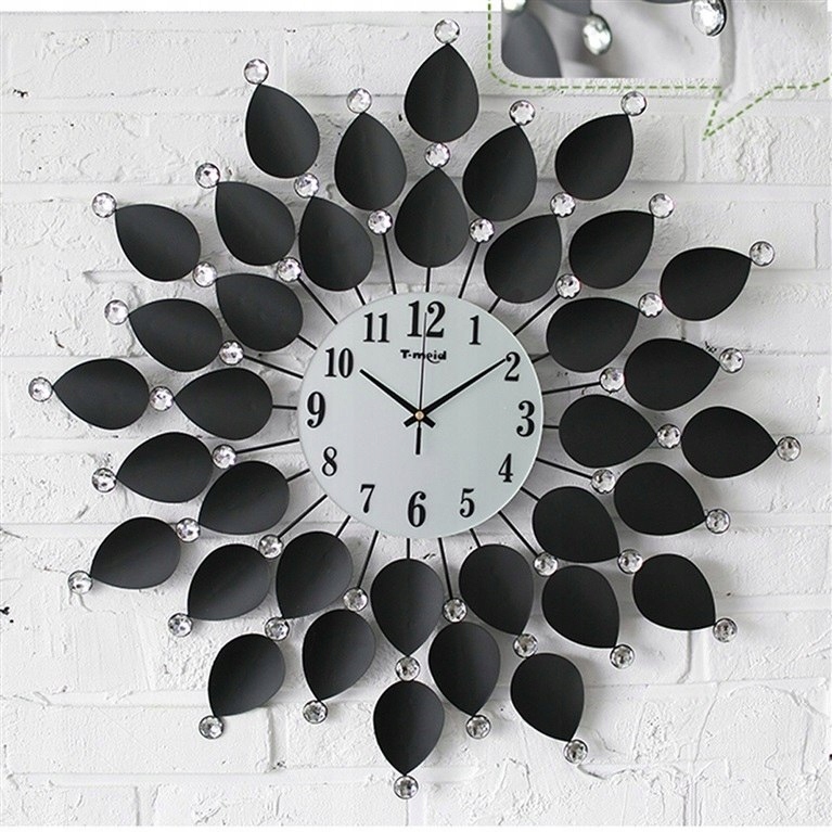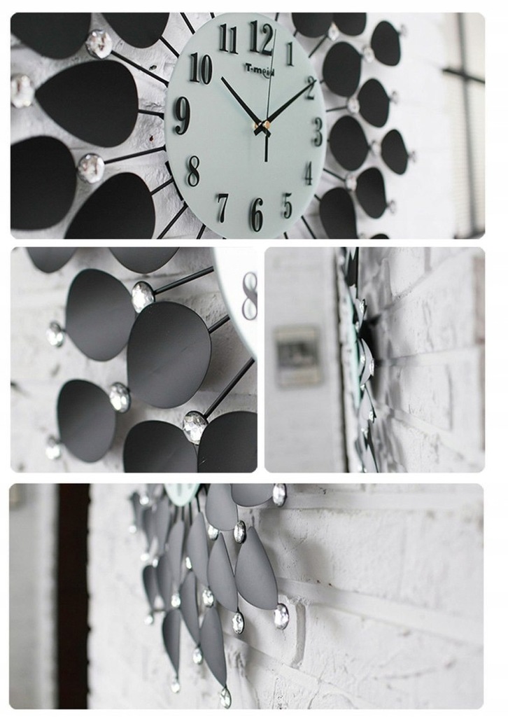 Efektownie i elegancko prezentuje się na ścianie. Szklana tarcza zegara otoczona jest czarnymi metalowymi liśćmi ozdobionymi błyszczącymi kryształkami.