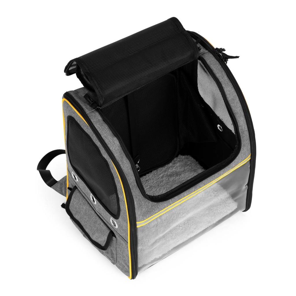 Wnętrze plecaka zostało wyposażone w miękką matę, która zadba o zwierzę zapewniając mu komfort podczas podróżowania. Mata jest przyjemna w dotyku i tworzy wygodne miejsce, idealne podczas podróży. Boczne kieszenie będą idealne do schowania smyczy, obroży, czy smakołyków. Jedna z nich posiada dodatkowe miejsce na woreczki z wygodnym "oczkiem" ułatwiającym ich wyciąganie.