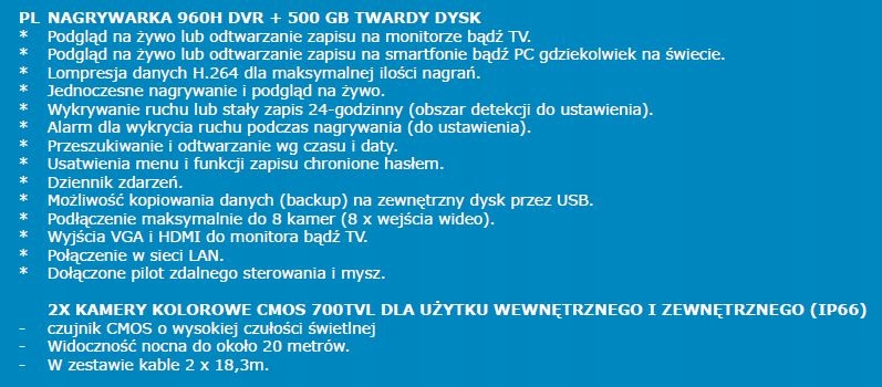 - ilość kamer 2 (możliwość dokupienia przez nas do 8 kamer)