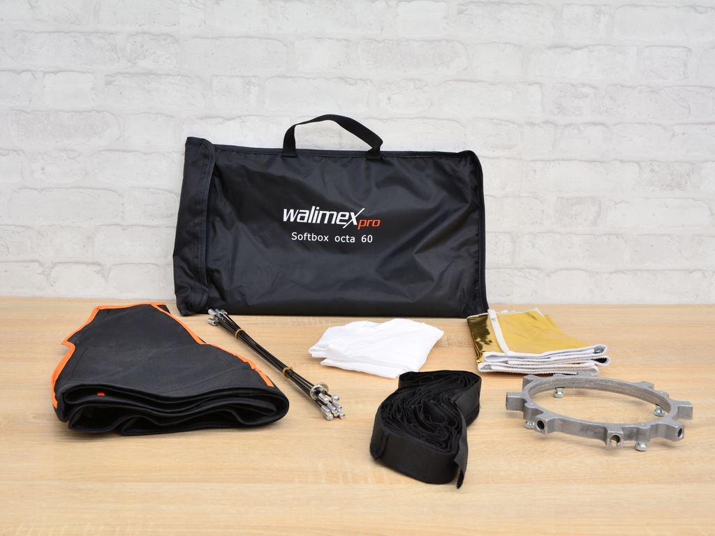 - zawiera: 1x adapter walimex pro Octa Softbox PLUS OL Ø60 Auro./BowensSoftbox w komplecie. softbox, drążki, dyfuzor tylny, dyfuzor przedni i torba transportowa