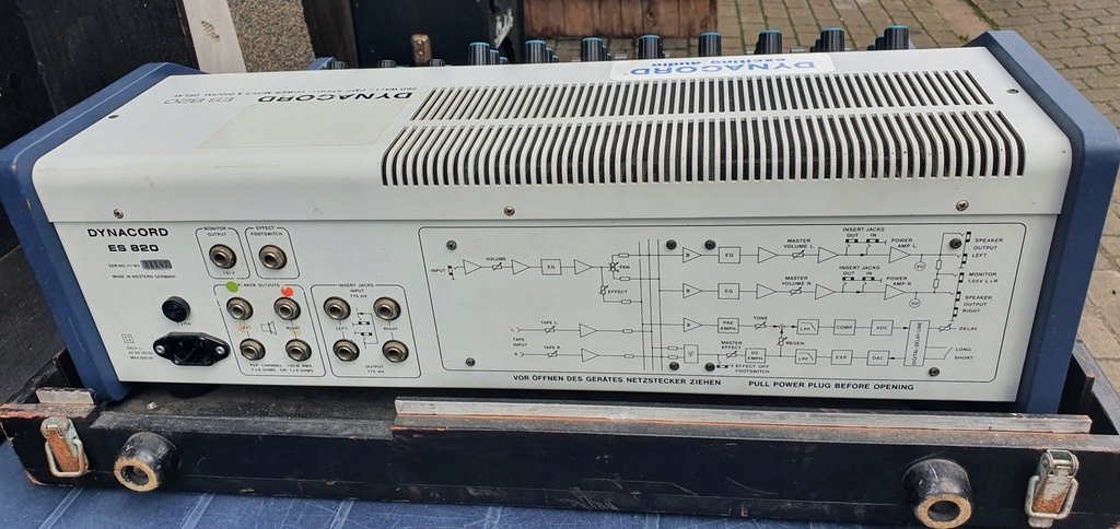 dynacord powermixer es 820 ,ogólnie jest sprawny,jedynie ulamany jeden potencjometr (galka,widoczne na foto) i po włączeniu czuc jakby spalony kurz czy coś podobnego ,z czasem mija..optycznie jak na foto,case w komplecie, echolette na innej aukcji.