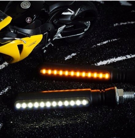 Przednie kierunkowskazy świecą białym światłem DRL, a po włączeniu kierunkowskazu gaśnie białe światło i uruchamia się sekwencja pływających kierunkowskazów.