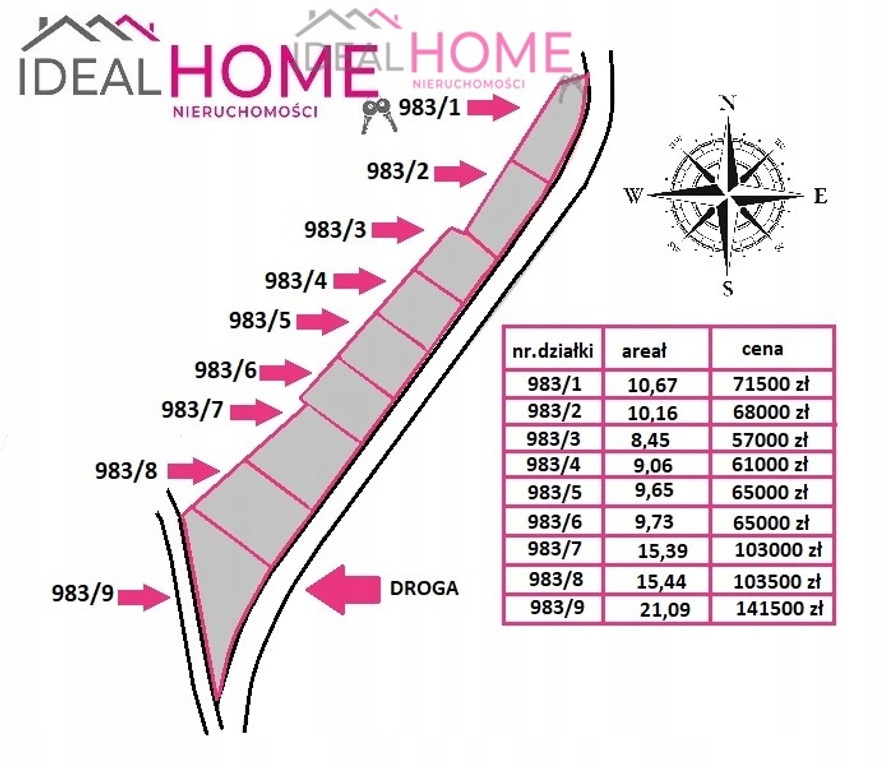 - działka nr. 983/2, powierzchnia działki 10,16 ar, wymiary: szerokość 23,61 m, długość 43,44m, cena 68000 zł,