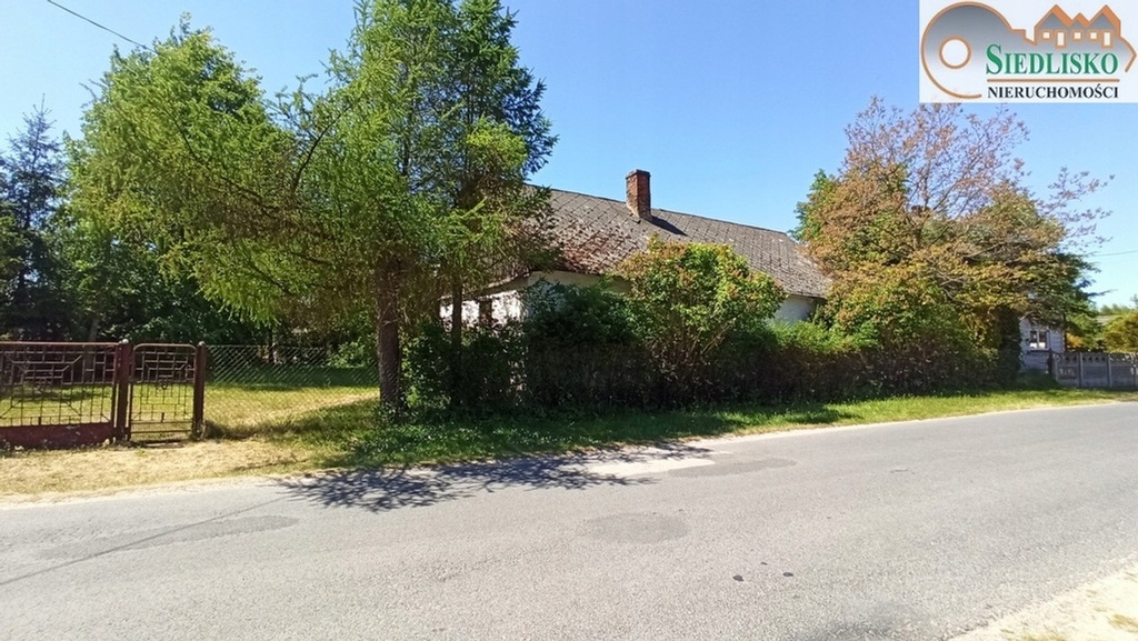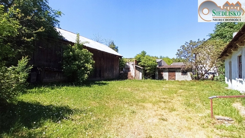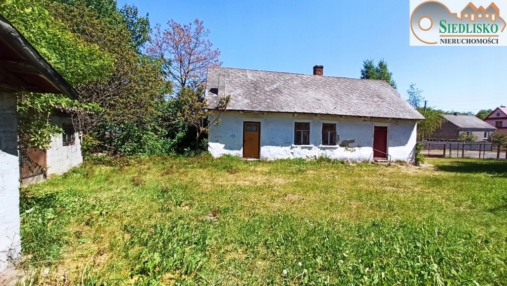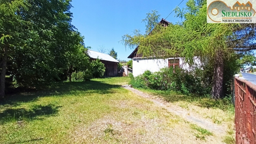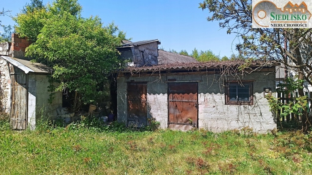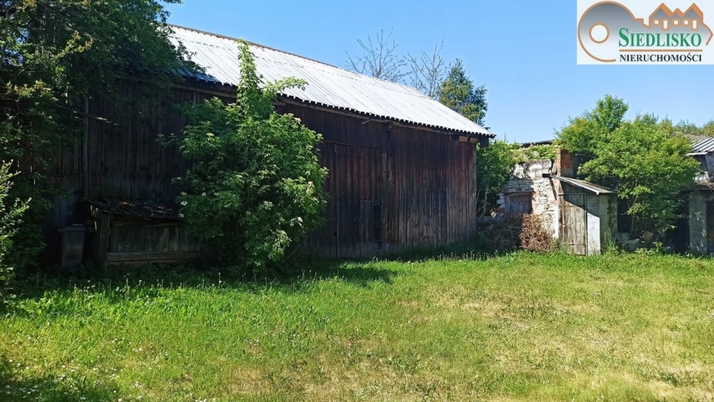 Działka w całości budowlana o powierzchni 726 m2 - zabudowana jest domem drewniano-murowanym, wybudowanym w 1913 r., drewnianą stodołą i murowanym budynkiem gospodarczym. Cała zabudowa wymaga kapitalnego remontu. Działka odcinkiem 31 m przylega do drogi gminnej asfaltowej, ma kształt nieregularny, w całości jest ogrodzona. Media: - do domu doprowadzona jest woda z wodociągu miejskiego oraz prąd, możliwość korzystania ze wspólnej z sąsiadem studni. Sąsiedztwo stanowi zabudowa mieszkaniowa jednorodzinna. Okolica zielona, cicha i spokojna.