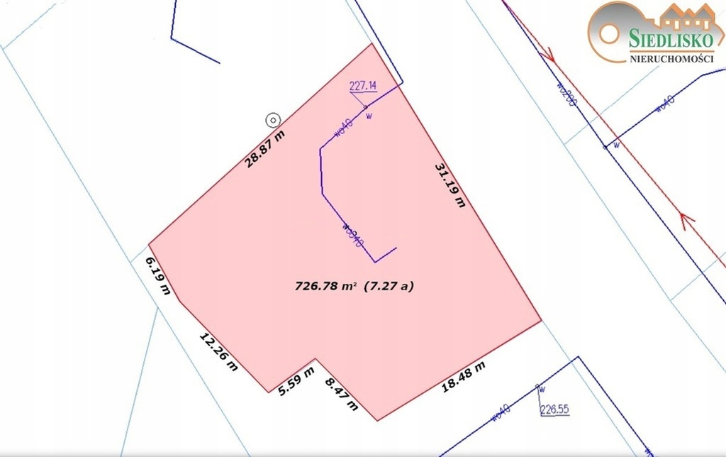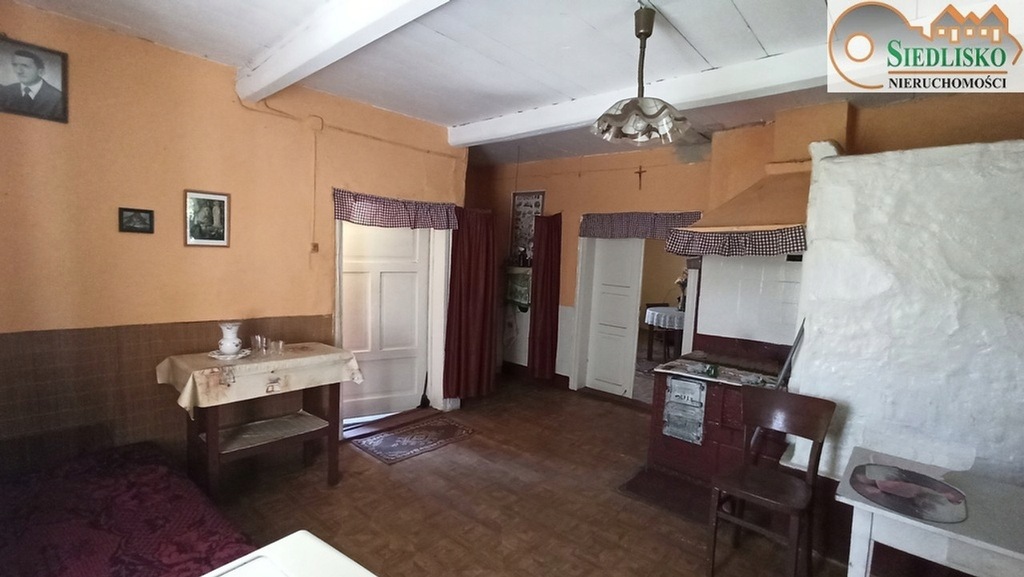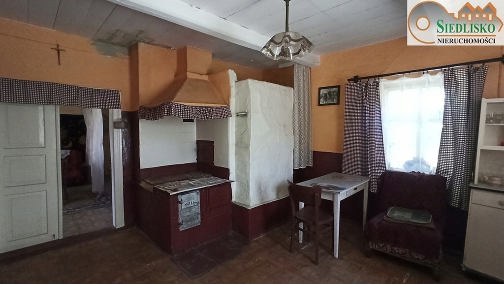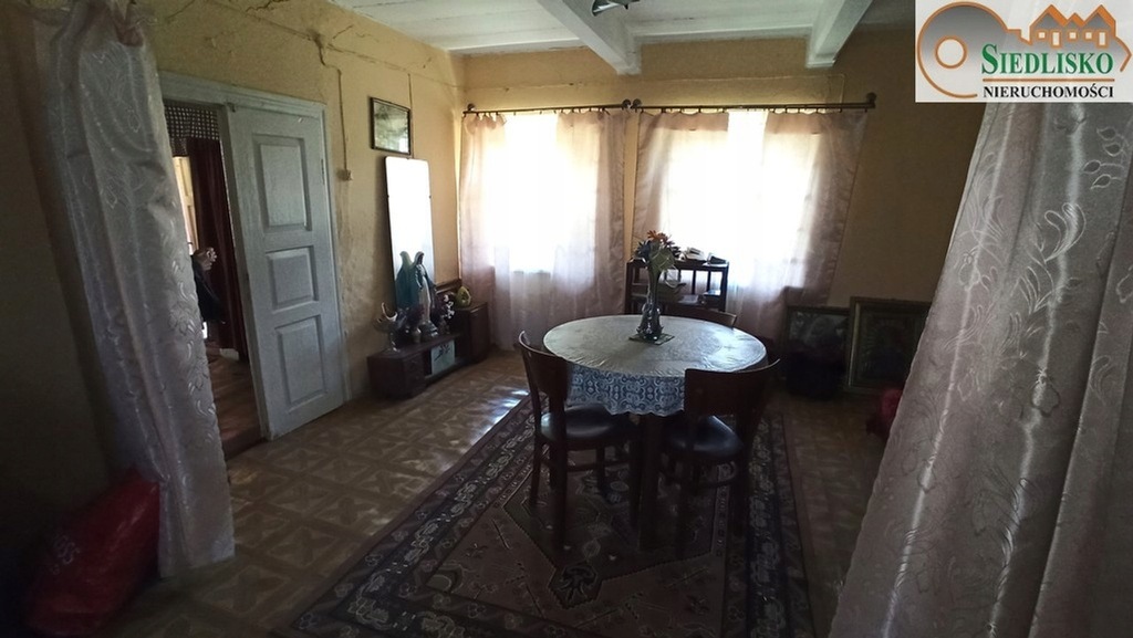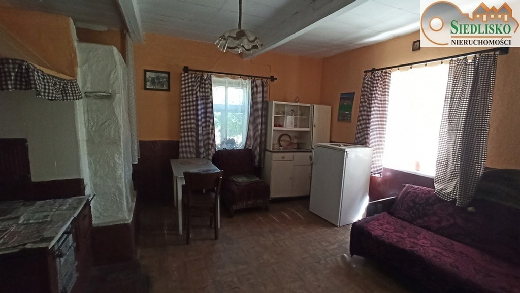 Działka w całości budowlana o powierzchni 726 m2 - zabudowana jest domem drewniano-murowanym, wybudowanym w 1913 r., drewnianą stodołą i murowanym budynkiem gospodarczym. Cała zabudowa wymaga kapitalnego remontu. Działka odcinkiem 31 m przylega do drogi gminnej asfaltowej, ma kształt nieregularny, w całości jest ogrodzona. Media: - do domu doprowadzona jest woda z wodociągu miejskiego oraz prąd, możliwość korzystania ze wspólnej z sąsiadem studni. Sąsiedztwo stanowi zabudowa mieszkaniowa jednorodzinna. Okolica zielona, cicha i spokojna.