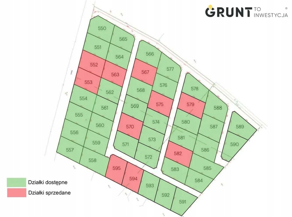 Teren osiedla został podzielony na 46 działek budowlanych o zróżnicowanych powierzchniach od 551 m² do 714 m² (możliwość łączenia sąsiednich działek). Foremne kształty parceli ułatwią ich przyszłe zagospodarowania, a zrealizowane badania geotechniczne gruntu potwierdzają korzystne warunki do budowy domu.