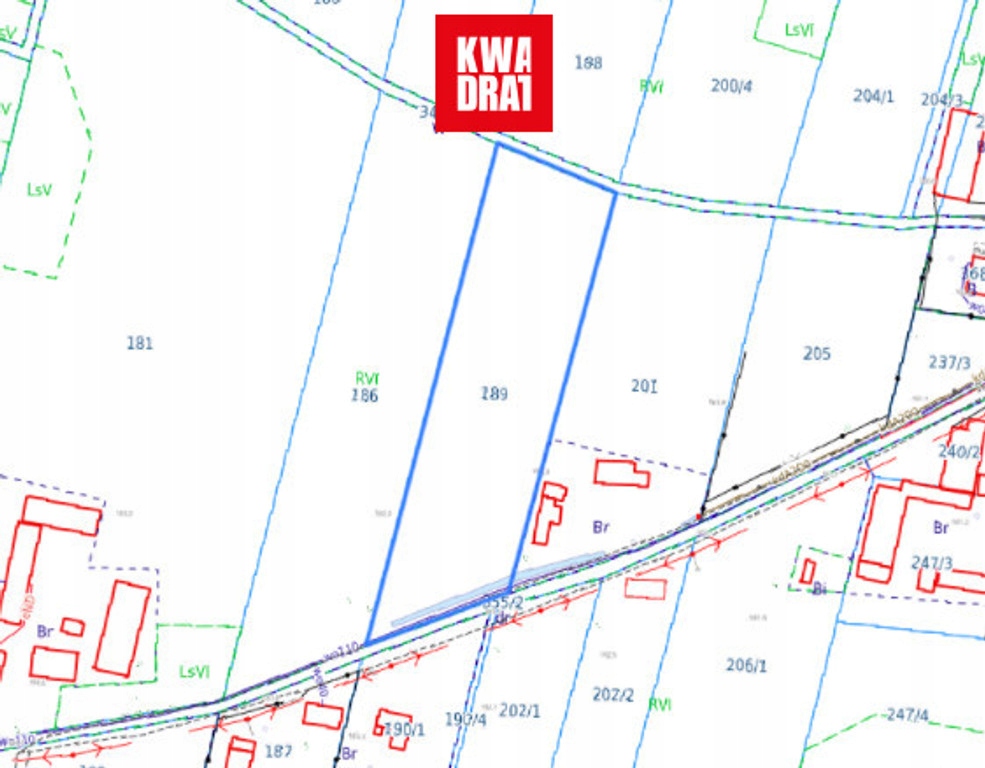 Pierwsza mniejsza działka nr. 189 o powierzchni 4550 m2, posiada bezpośredni dostęp do drogi publicznej.