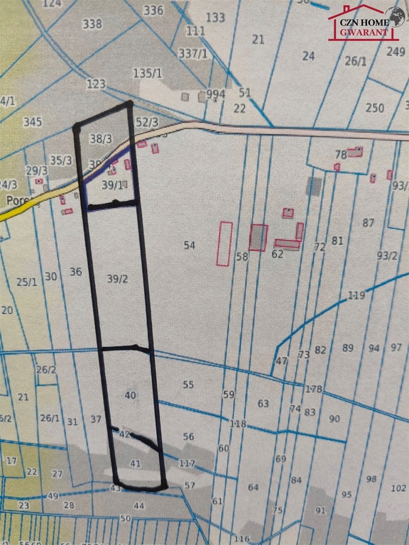 Działka składa się z kilku numerów, na działce o numerze 39/1 o powierzchni 5.117 m2 znajdują trzy budynki mieszkalne, pierwszy składający się z czterech pokoi, łazienki pomieszczenia gospodarczego i garażu, drugi z jednego pokoju, łazienki i pomieszczeń gospodarczych i trzeci drewniany. Dostępne media to prąd i wodociąg w budynkach. Wszystkie budynki zadbane w bardzo dobrym stanie spełniające jedynie funkcję domów letniskowych ponieważ brak w nich jest centralnego ogrzewania. Działka o nr 38/3 o powierzchni 5.716 m2 jest działką leśną znajdującą się po drugiej strony drogi asfaltowej. Działki o numerach 39/2, 40, 41 o powierzchni 4,158 m2 przylegają do działki nr 39/1 i tworzą całość o szerokości 85 m i długości 557 m, do działek tych od asfaltu prowadzi dodatkowo osobna droga dając możliwość osobnej sprzedaży.