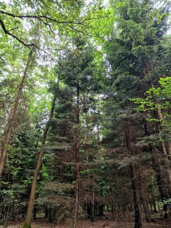 Las w przewadze iglasty, głównie jodła, wzdłuż jednej z granic posadzone dęby.
