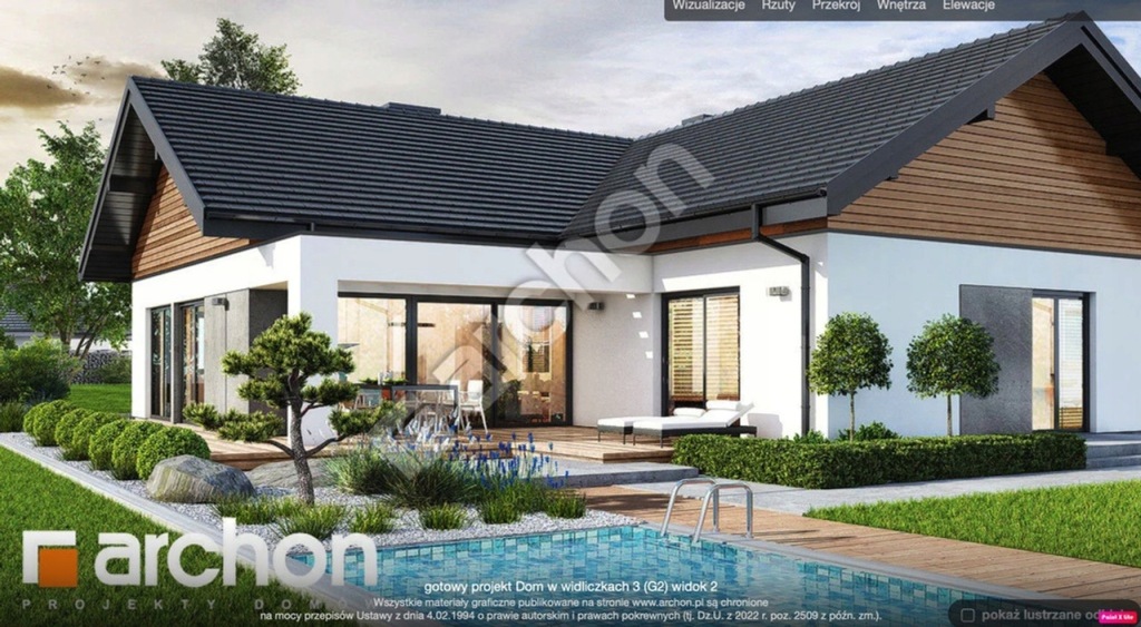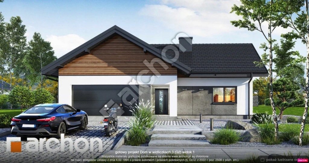 W cenie projekt architektoniczno – budowlany budynku mieszkalnego jednorodzinnego „Dom w widliczkach 3 (G2) lustrzane odbicie” pracowni projektowej Archon oraz do dyspozycji Decyzja zatwierdzająca projekt budowlany z udzieleniem pozwolenia na budowę.