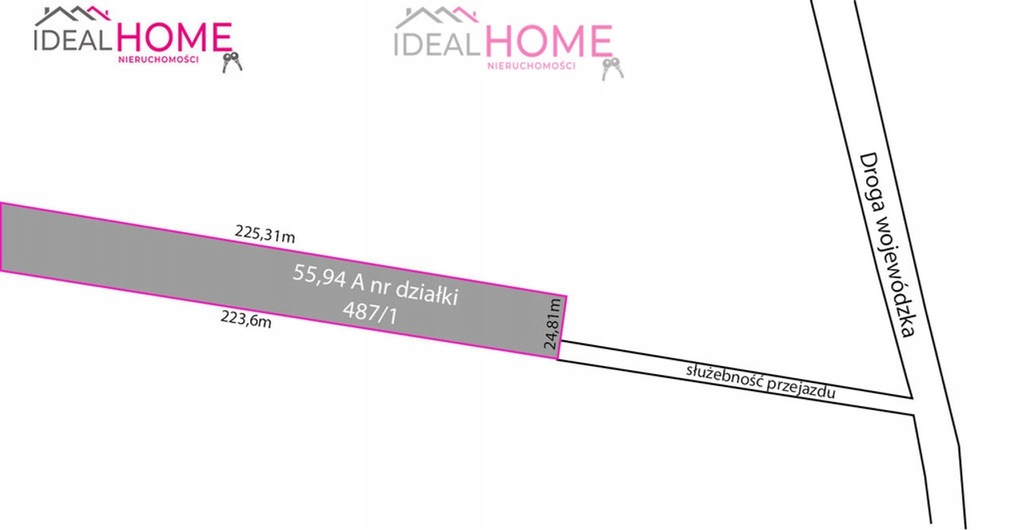 Prezentowana działka ma powierzchnię 55,94a, o kształcie prostokąta. Ma ona następujące wymiary: szerokość 24,86m, długość 225,1m