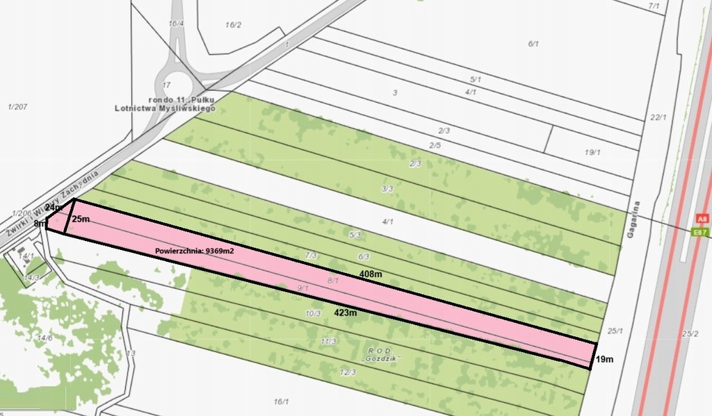 Działka z bezpośrednim dostępem do asfaltowej drogi publicznej przy ul. Żwirki i Wigury, oraz drogi od strony AOW. Jest położona pomiędzy ogrodami działkowymi Goździk, w sąsiedztwie AOW. Media w drodze przy działce: gaz, prąd i woda.
