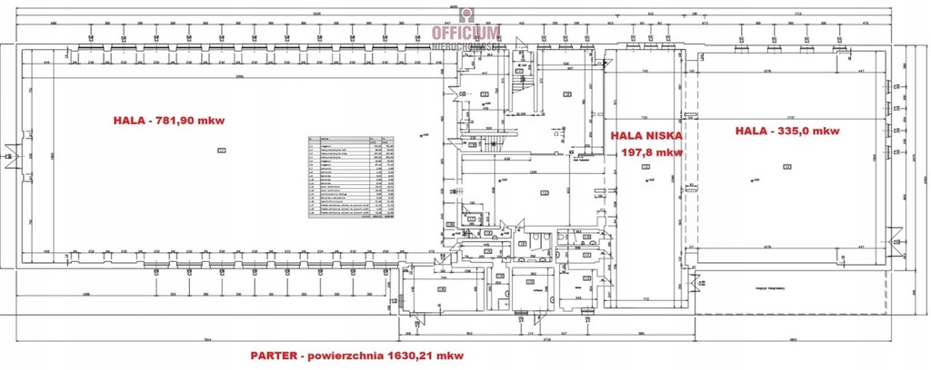 PARTER - łączna powierzchnia 1630,21 mkw - zawiera dwie hale o wysokości 6,8 m do dachu - 4,1 m do dołu kratownicy : pierwsza hala ma powierzchnię 782 mkw - 525 miejsc paletowych ( każda ma osobny dostęp dla dostaw ) oraz druga hala 338 mkw, dodatkowo jest hala niska o powierzchni ok. 200 mkw. Hale oddzielone są od siebie dwukondygnacyjną częścią biurowo-socjalną dla której wydzielono osobne wejście od ulicy, znajdują się tu dwa jasne pomieszczenia produkcyjno - pomocnicze oraz łazienki, wc , biuro, hol, pomieszczenie gospodarcze.