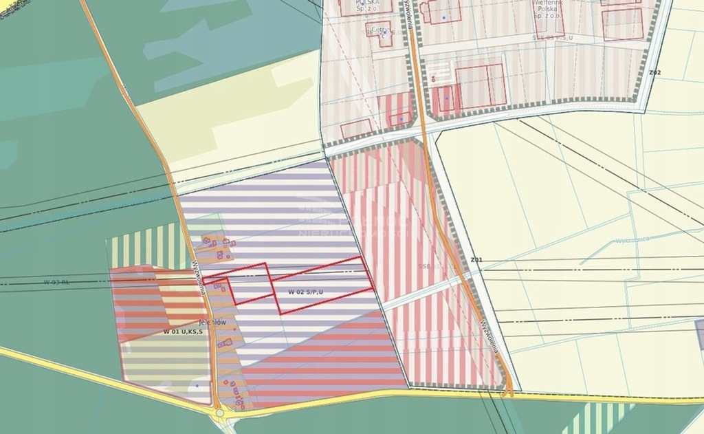 Opis przeznaczenia: §5 Ustalenia szczegółowe W 02 S/P,U - Teren projektowanych składów, hurtowni i nieuciążliwej produkcji. Obsługa komunikacyjna wyłącznie za pośrednictwem dwóch, trzech wjazdów z drogi nr 296. Dopuszcza się: - adaptację istniejącej zabudowy zagrodowej na funkcje usługowe, (np. administracja gospodarcza, obiekty socjalne obsługi komunikacji itp.); - lokalizację usług (warsztaty, stacja paliw) w płd. części zespołu.Obowiązuje od: 1996-12-06Informacje szczegółowe: 14-W02S_P,UNumer uchwały: XXI/229/96Opis: Teren projektowanych składów, hurtowni i nieuciążliwej produkcjiSymbol: W 02 S/P,U