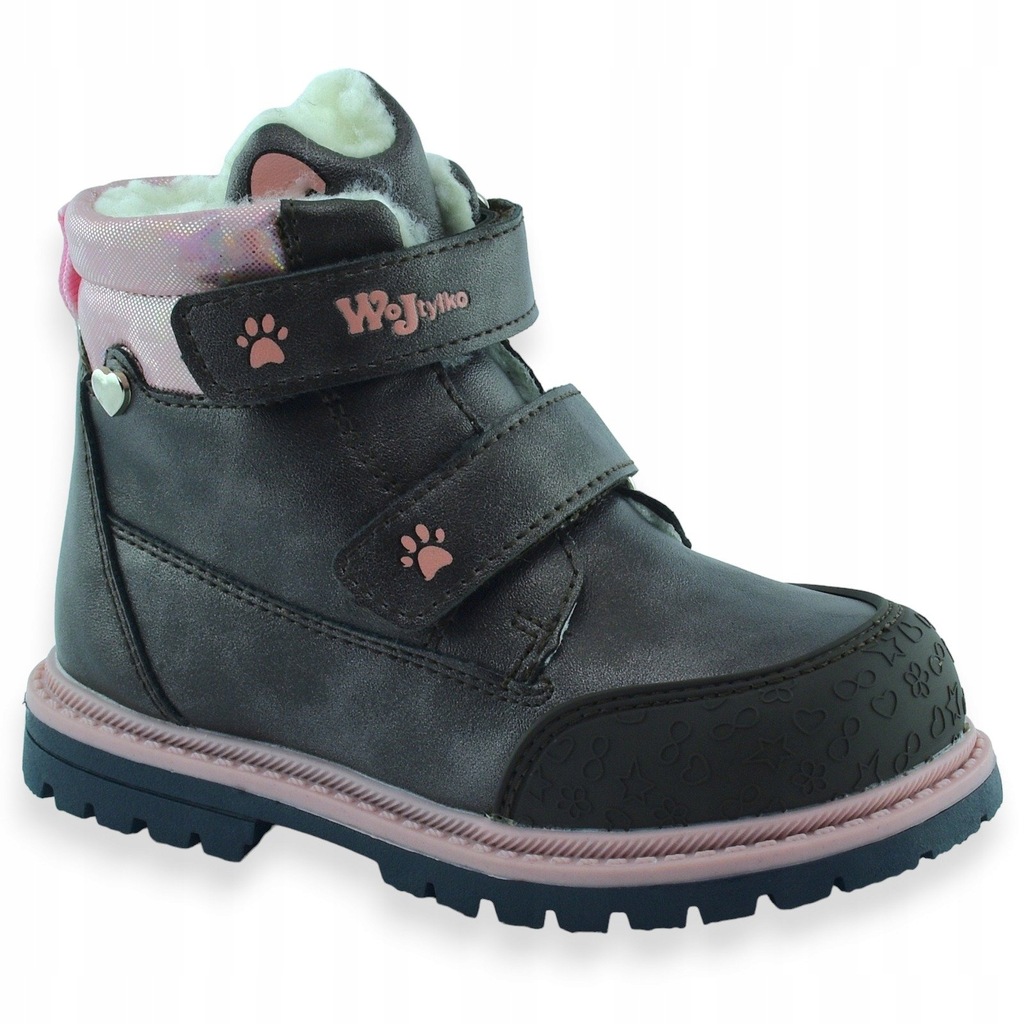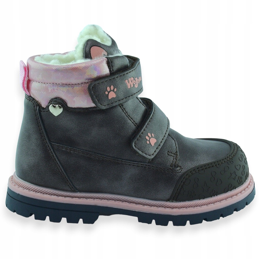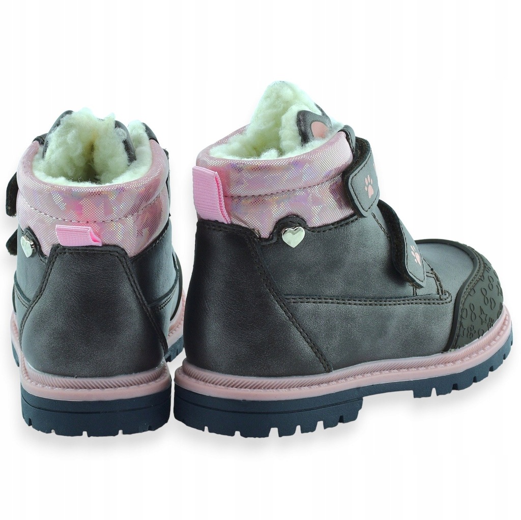 Ciepłe buty za kostkę dla dziewczynki w szarym metalicznym kolorze, zapinane na dwa wygodne rzepy. Dodatki w różowym kolorze sprawiają, że są bardzo urocze i dziewczęce. Środek ocieplony białym sztucznym kożuszkiem. Przód zabezpieczony gumą.