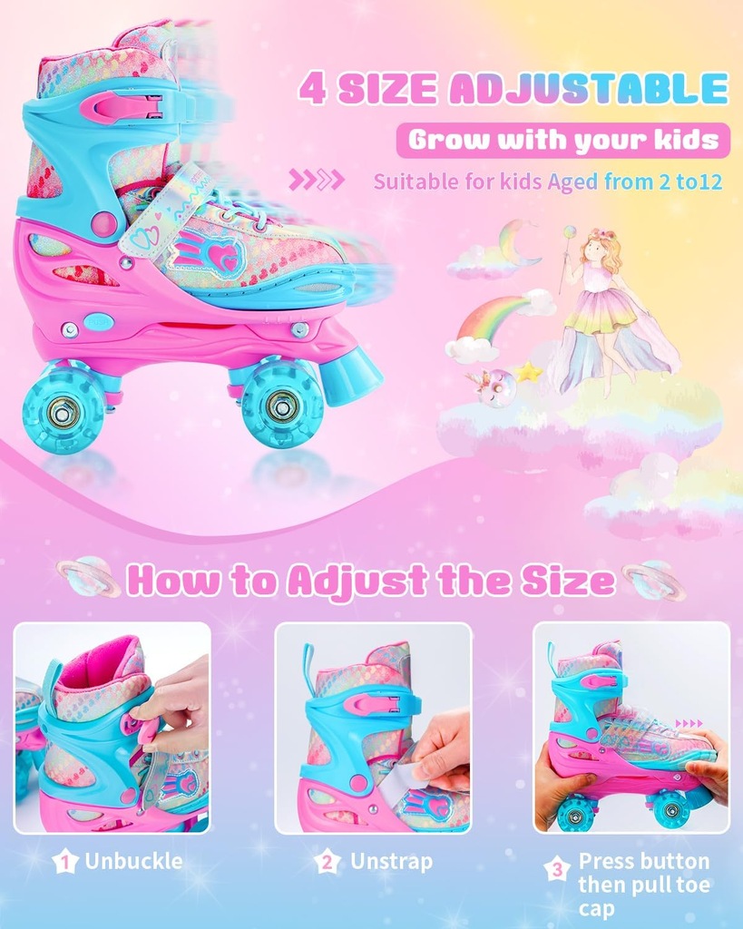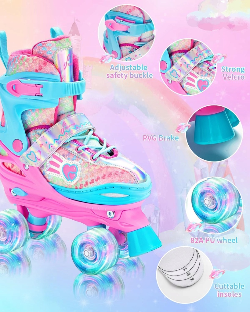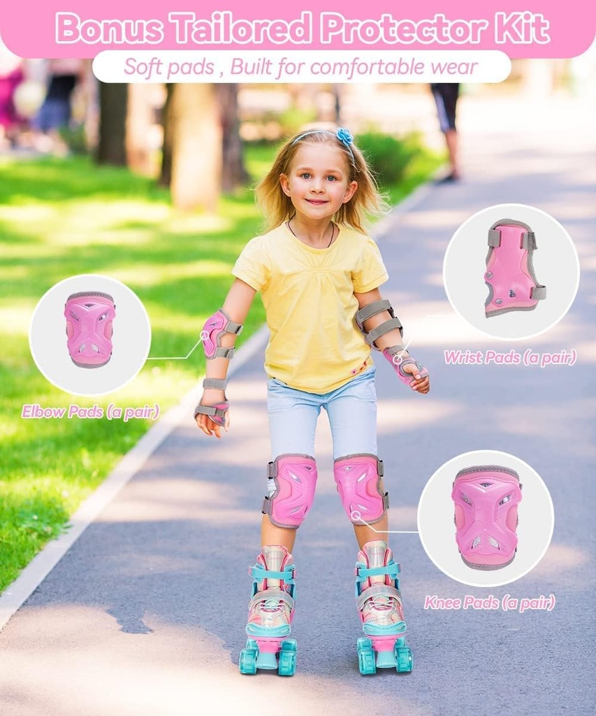 Dziecięce wrotki o regulowanym rozmiarze (34–37), z kolorowym wykończeniem i efektownymi świecącymi kółkami LED (działają bez baterii – świecą podczas jazdy). Do kompletu dołączony pełen zestaw ochraniaczy: na kolana, łokcie i nadgarstki – wszystko w dopasowanej kolorystyce.