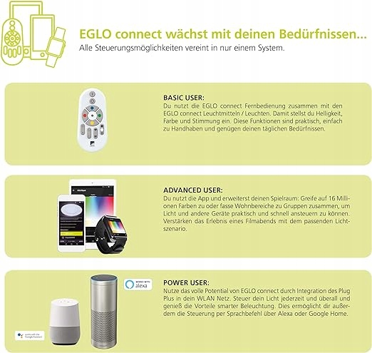- Away from Home control poprzez sterowanie Wi-Fi, z poleceniami głosowymi Amazon Alexa (Echo, Echo Dot) i Google Home – EGLO Plug Plus (sprzedawany oddzielnie).