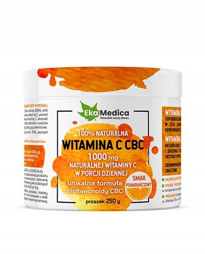 Naturalna Witamina C CBC od EkaMedica z kompleksem CBC jest o smaku pomarańczowym. Dodatkowo w opakowaniu znajduje się miarka, w postaci łyżeczki ułatwiająca precyzyjne dozowanie produktu. Witamina C: