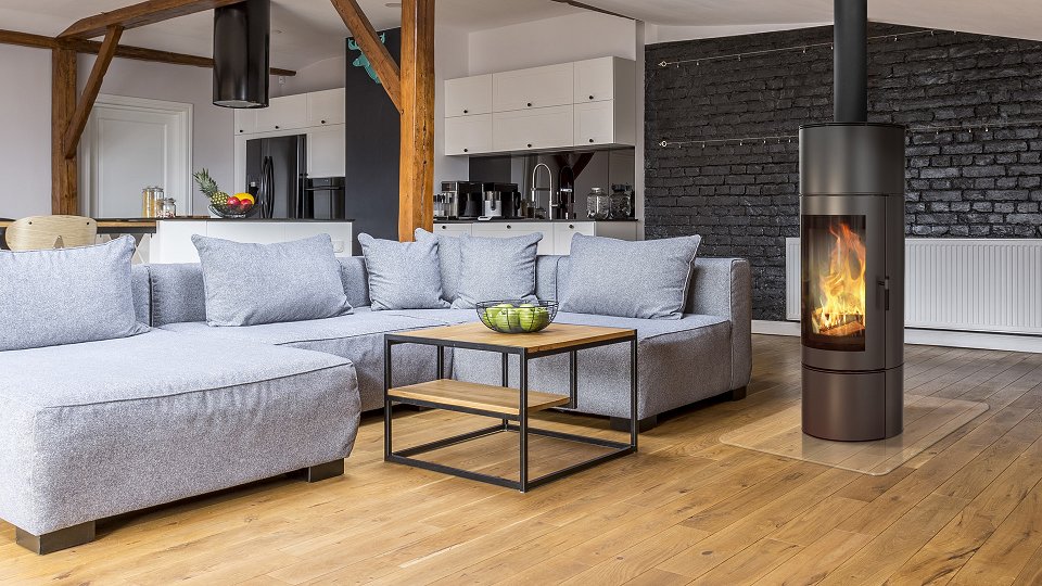 Przestronne przeszklenie uatrakcyjnia wizję ognia. Wnętrze pieca wyłożone innowacyjnym materiałem TERMOTEC doskonale kontrastuje z bryłą, nadając całości nowoczesnego wyglądu.