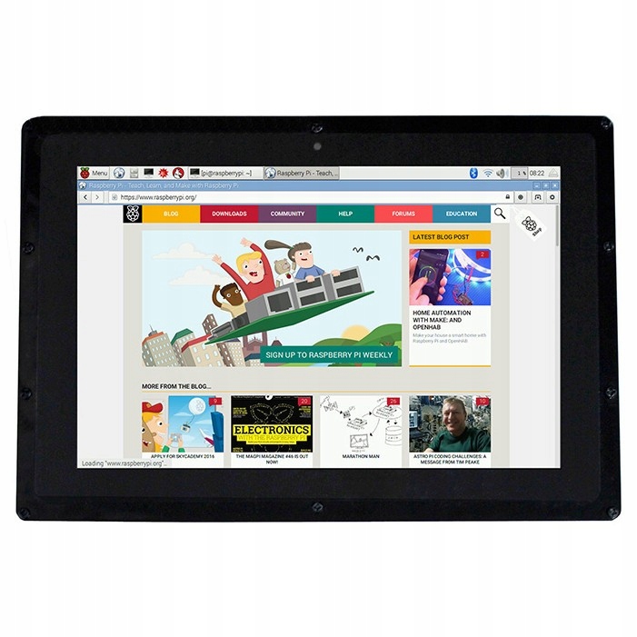 Ekran z matrycą IPS 10,1 '' 1280 x 800 px firmy Waveshare. Posiada panel dotykowy pojemnościowy. Współpracuje z Raspberry Pi w wersji 4B, 3B+, 3B+ 2B, 1B+, 1B, 1A oraz Zero i Zero W poprzez złącze HDMI i przewód USB. W zestawie również czarna obudowa, która mieści minikomputer z przymocowanym ekranem.