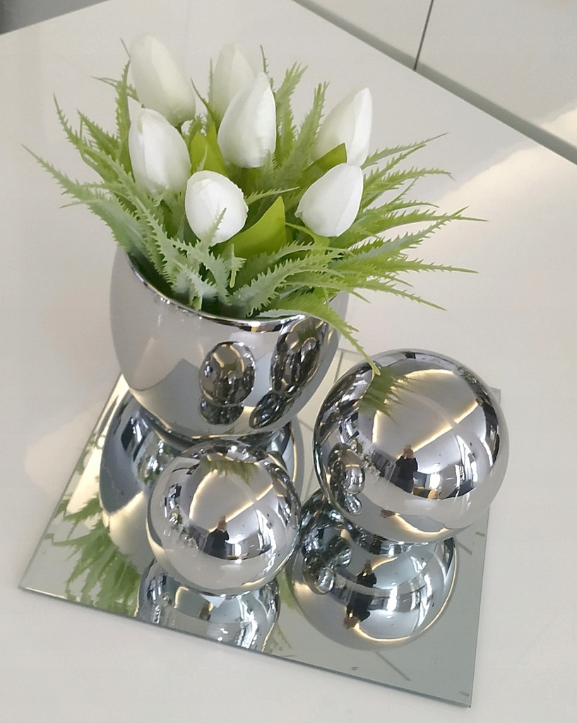 W SKŁAD ZESTAWU WCHODZĄ DWIE KULE CERAMICZNE, WAZONIK Z KWIATAMI I PODSTAWA LUSTRZANA.