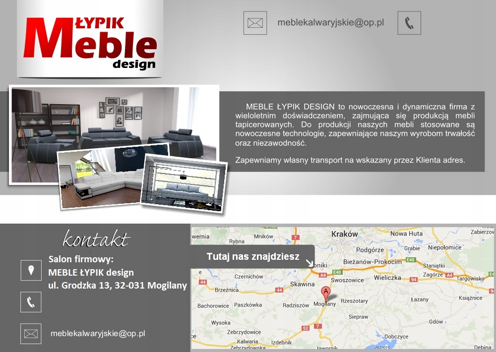 Adres mailowy oraz numer telefonu w informacji "O sprzedającej firmie" na dole aukcji. Koszt transportu jest ustalany od odległości. W przypadku transportu konieczność wcześniejszego ustalenia ceny. Meble dostarczamy w każde miejsce w kraju !!!