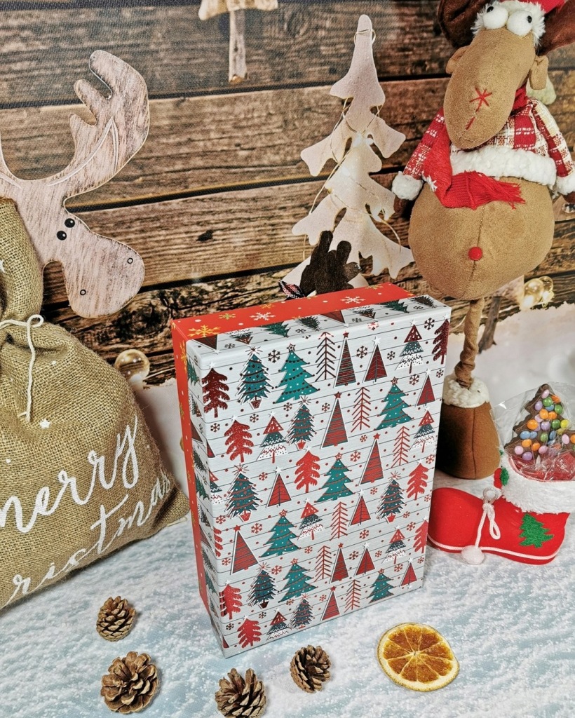 Świąteczne opakowanie doskonale nadaje się do zapakowania wyjątkowego prezentu. Pudełko wykonane z tektury.