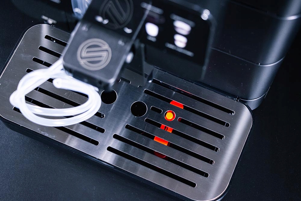 - sygnalizacja konieczności napełnienia zbiornika na ziarna, wskaźnik konieczności odkamieniania, wskaźnik pustego zbiornika na wodę, wskaźnik włączenia urządzenia, wskaźnik zapełnienia pojemnika na odpadki, wyświetlacz