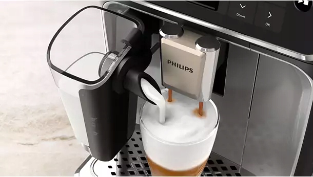 Wlej mleko do wbudowanego pojemnika. Ekspres sam pobierze odpowiednią ilość, podgrzeje je, spieni i wleje do szklanki. Niewykorzystaną część mleka razem z pojemnikiem możesz schować z powrotem do lodówki.