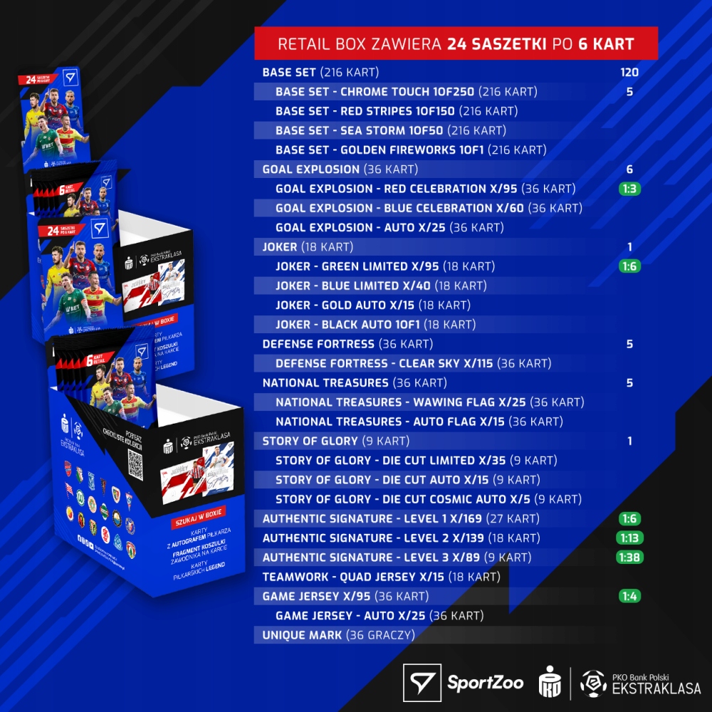 Druga seria bestsellerowej kolekcji kart piłkarskich Ekstraklasy na sezon 2023/24 przygotowana dla PKO Bank Polski przez SportZoo. Oprócz klasycznych kart z piłkarzami zawiera wyjątkowe dodatki oraz limitowane wersje. Znajdują się w niej m.in. zestawy kart sygnowanych autografami zawodników oraz pamiątkowe karty z akcesoriami meczowymi, takimi jak koszulki, buty piłkarskie, rękawice bramkarskie itp. W rezultacie zapaleni kibice będą mieli okazję zdobyć podpisy swoich ulubionych zawodników i kolekcjonować karty drużyn nie tylko w podstawowych wersjach, ale także karty z koszulkami czy innymi elementami wyposażenia piłkarskiego. Podstawowa saszetka z kartami oraz Blaster Pack pozwalają na zdobycie kart z, jedną z dwóch, Minigier. W saszetkach Hobby Pack możesz natomiast znaleźć kawałki Puzzli. Po złożeniu całości układanki będziesz mógł otrzymać nagrodę w postaci ekskluzywnej karty z podpisem zawodnika. Podstawowy kolekcja zawiera aż 216 kart! Oprócz nich będzie można zdobyć karty w wersjach Chrome Touch z limitem 1 na 400, z Czerwonym Paskiem 1 na 150, Sea Storn 1 na 50 i najrzadszą kartą ze złotym nadrukiem Golden Fireworks 1 na 1