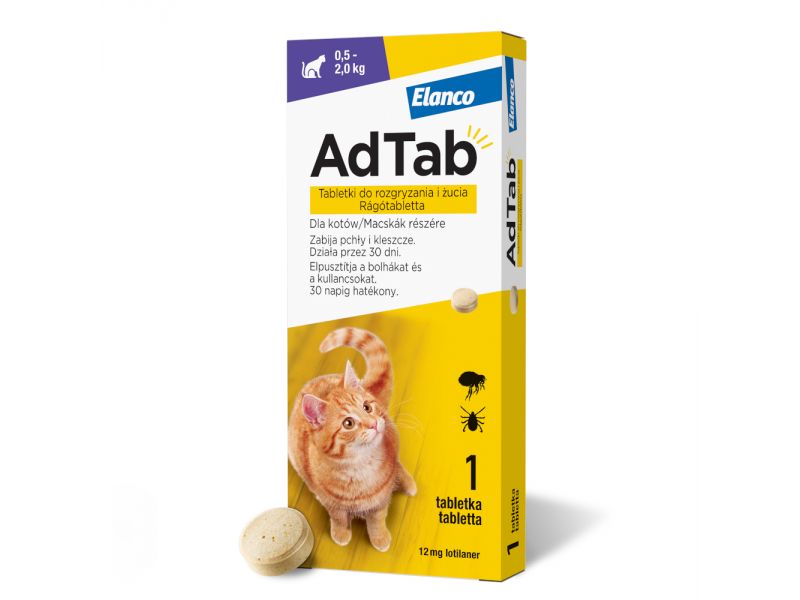 Aktywny składnik AdTab, lotilaner, działa na receptory nerwowe kleszczy i pcheł, oferując ochronę i skuteczne leczenie przez cały miesiąc. Dzięki niewielkim rozmiarom, postaci do rozgryzania i żucia oraz atrakcyjnemu mięsnemu smakowi, ten środek do stosowania wewnętrznego dla kotów jest bardzo dobrze akceptowany i łatwy do podania. Tabletka zabija pchły i kleszcze w krótkim czasie, po ukąszeniu zwierzęcia i kontakcie z substancją czynną.