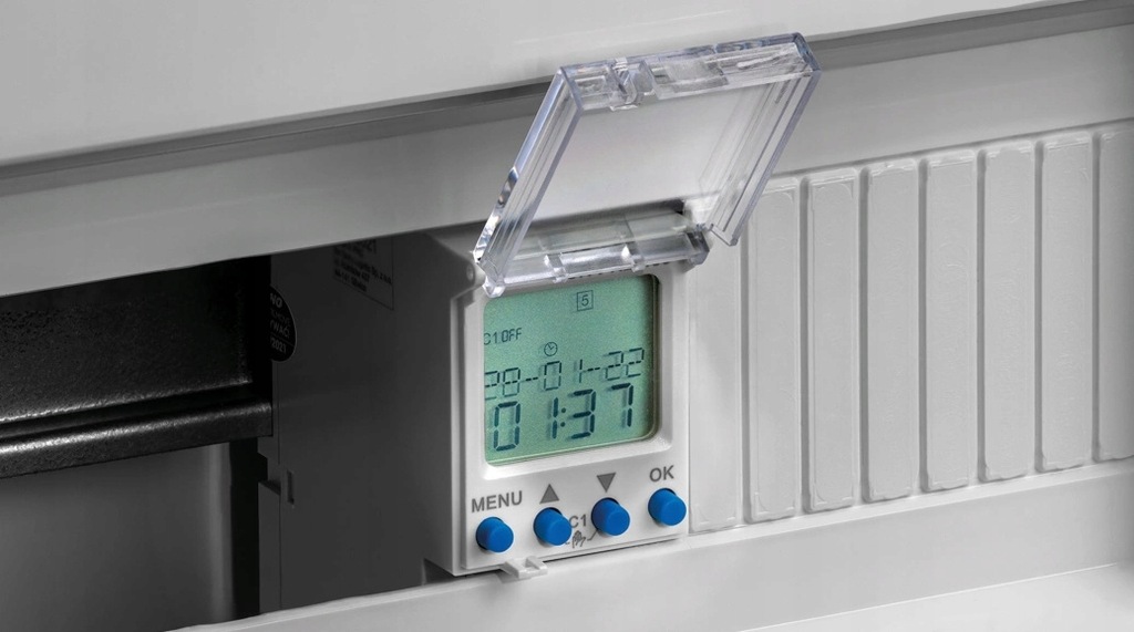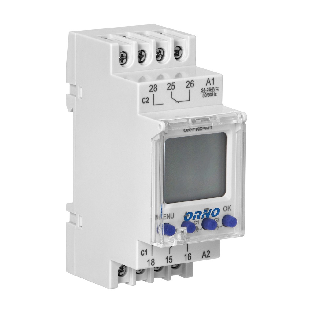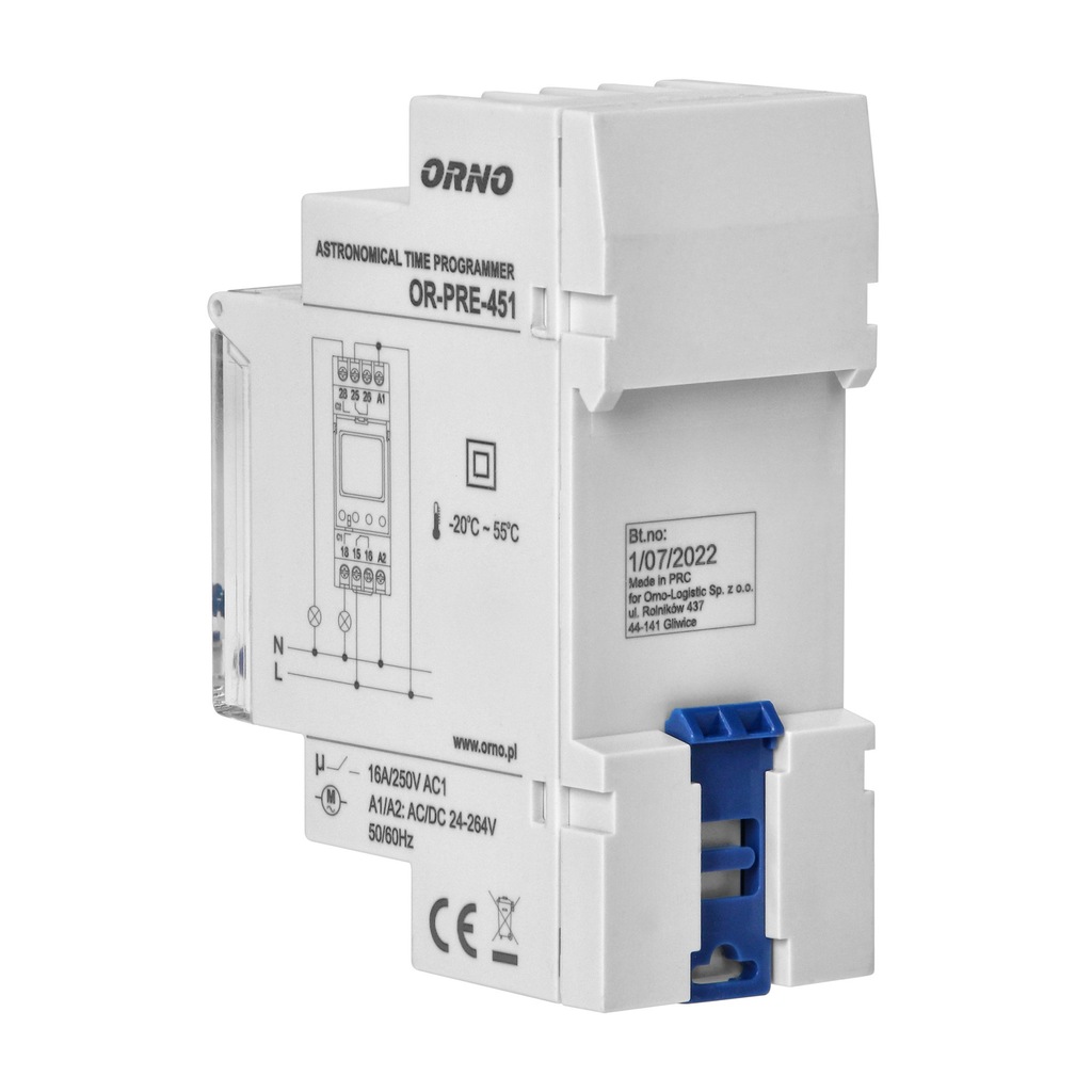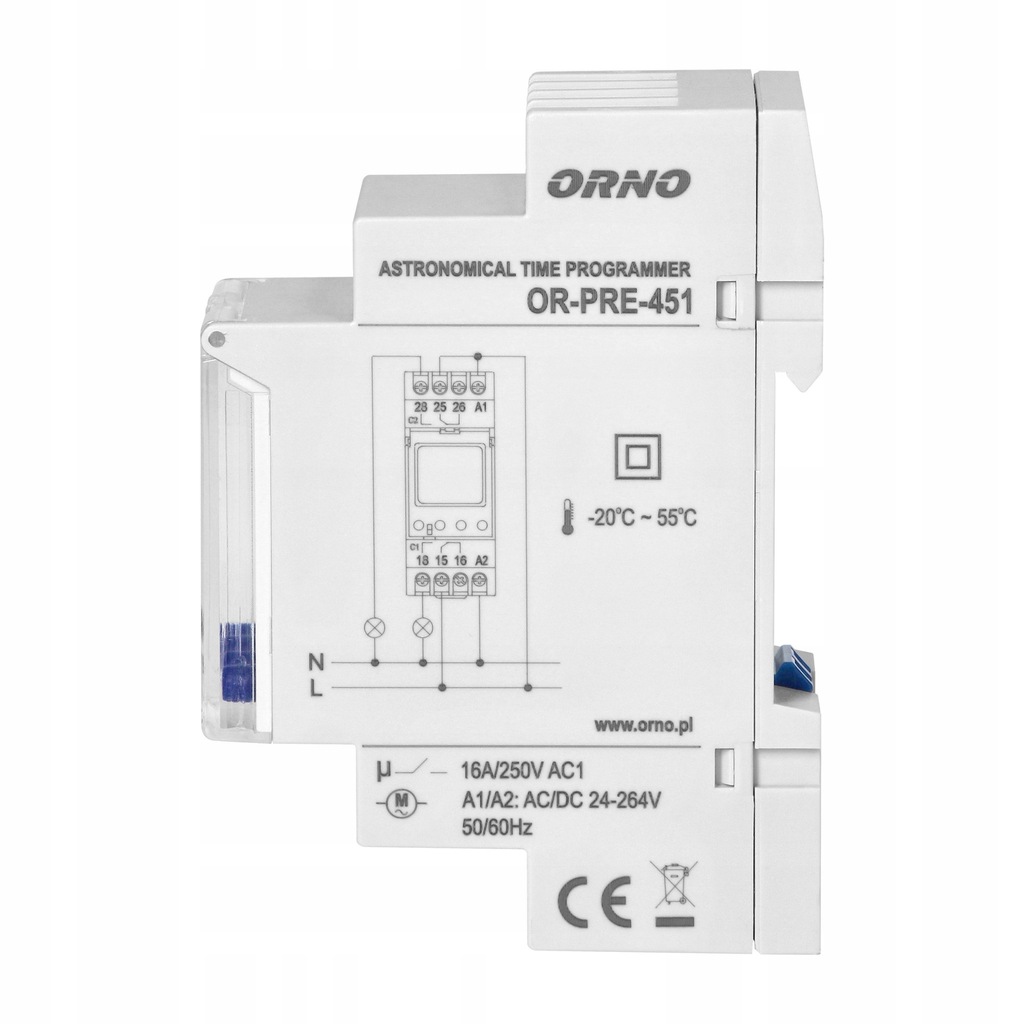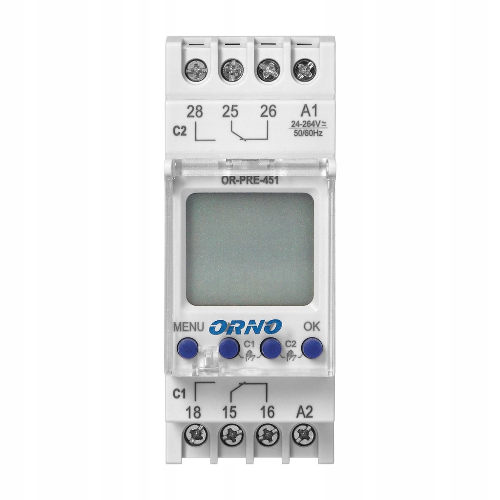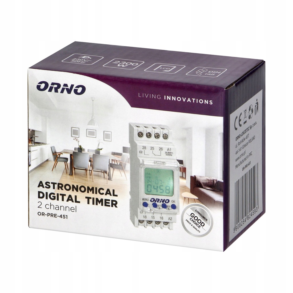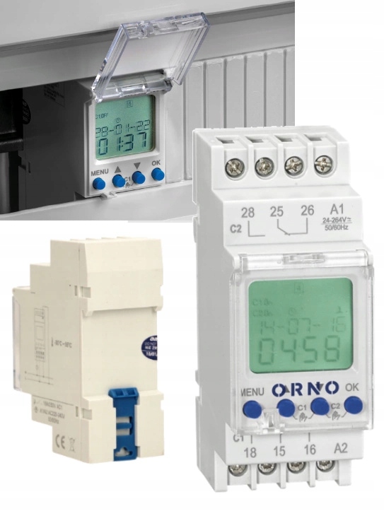 Elektroniczny programator astronomiczny i czasowy, 100 programów, 3 języki menu, 2 wyjścia przekaźnikowe max.16A/230V, szerokość 2 moduły, DIN TH-35mm
