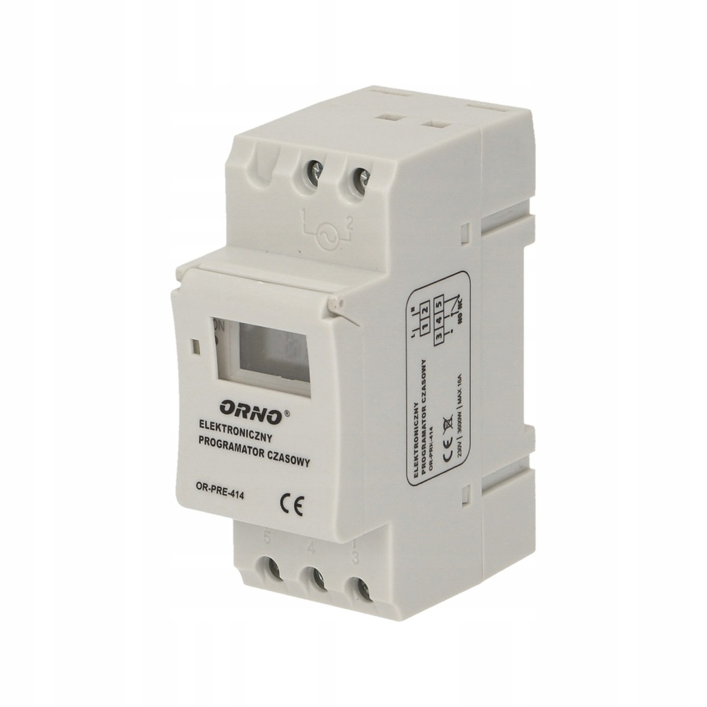 Elektroniczny programator czasowy z wyświetlaczem LCD przystosowany do montażu na standardowej szynie DIN TH-35 mm. Służy do ustawienia czasu włączania i wyłączania urządzeń elektrycznych takich jak: ogrzewacze wody, oświetlenie, silniki, pompy itp. Urządzenie posiada: 16 programów czasowych, ustawienie cyklu dziennego lub tygodniowego, podtrzymanie ustawień zegara w przypadku zaniku prądu.