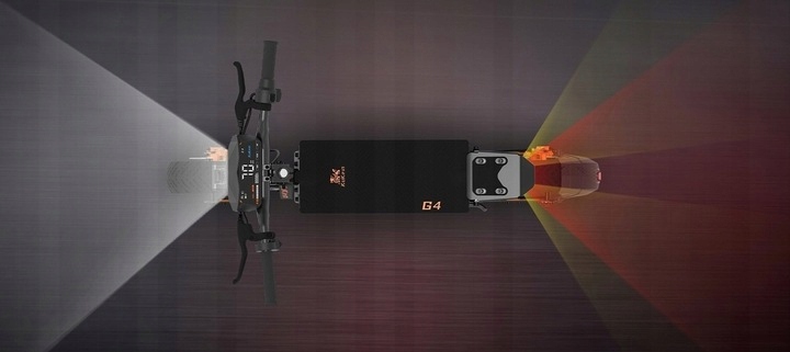 KuKirin G4 działa przednie reflektory z dwoma sygnałami kierunkowymi i zewnętrznymi światłami układu z dwoma światłami ostrzegawczymi skrętu do wygodnego ruchu nocnego. Nie spełnia tylko wymagań oświetlenia nocnego, ale zapewnia również bezpieczeństwo jazdy nocnej.