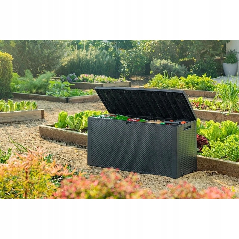 Plastikowa skrzynka do przechowywania różnych przedmiotów (poduszek, narzędzi ogrodowych...) firmy KETER Zaletą tej skrzyni jest prosty montaż (bez narzędzi - można złożyć wszystko jak zestaw), wysoka jakość skrzyni i nowoczesny design Materiał posiada ochronę UV i jest odporny na warunki atmosferyczne.