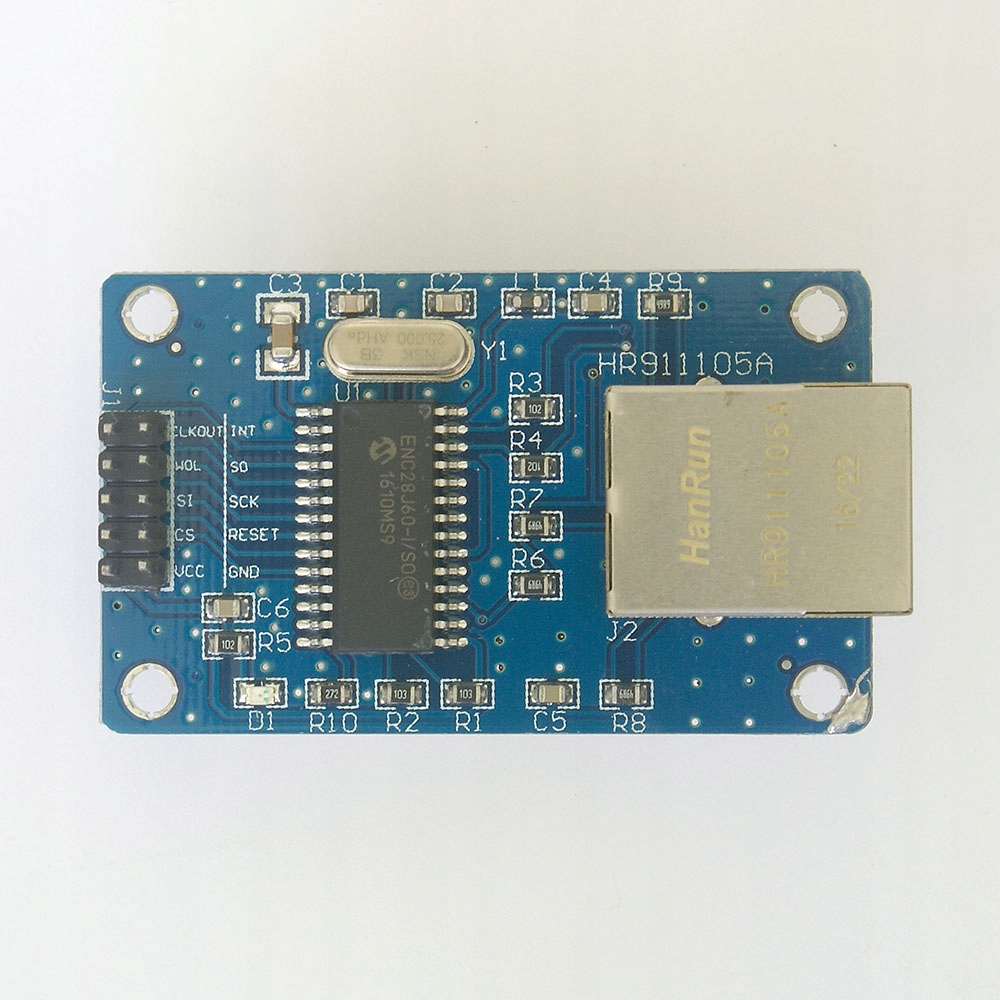 Moduł przeznaczony do podłączenia mikrokontrolerów typu Arduino z siecią LAN za pomocą interfejsu cyfrowego SPI.